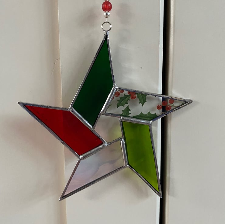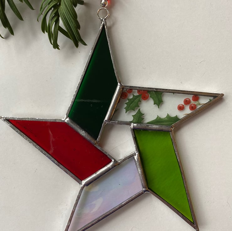 A beautiful 5 point stained glass star made using the Tiffany ( copper foiled ) method of stained glass with a pentagon shaped central hole . Each piece of glass is a different colour, ( clear iridescent , lime green , pine green, red , holly berry )