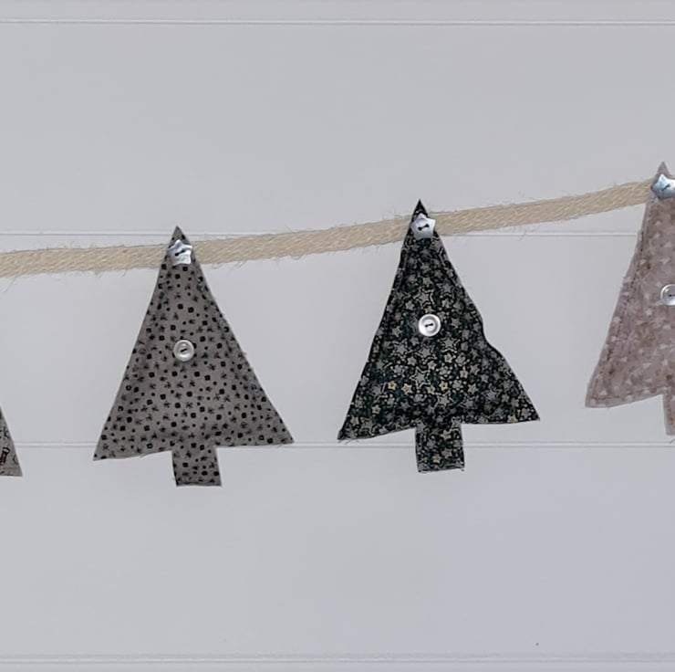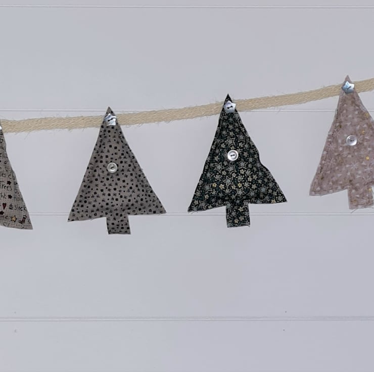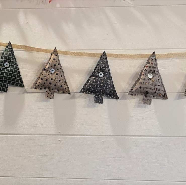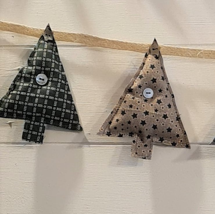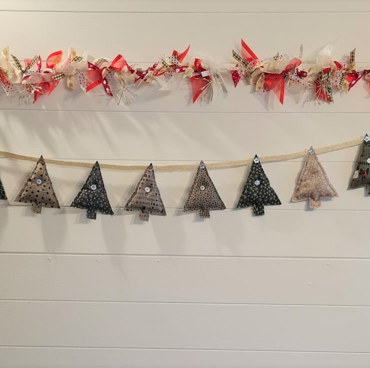 A garland of 8 lightly stuffed Christmas trees, hand stitched from beautiful Lynette Anderson fabric. The trees are attached to ivory hessian ribbon with cute shell buttons. The garland is approx 33 inches/83 cm long with an extra 9 inches of ribbon and a hanging loop at each end.