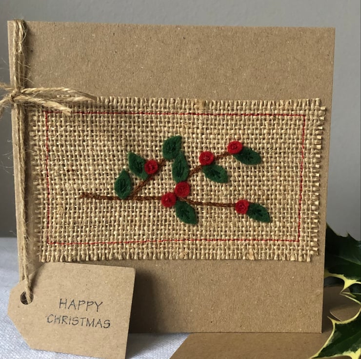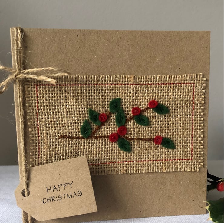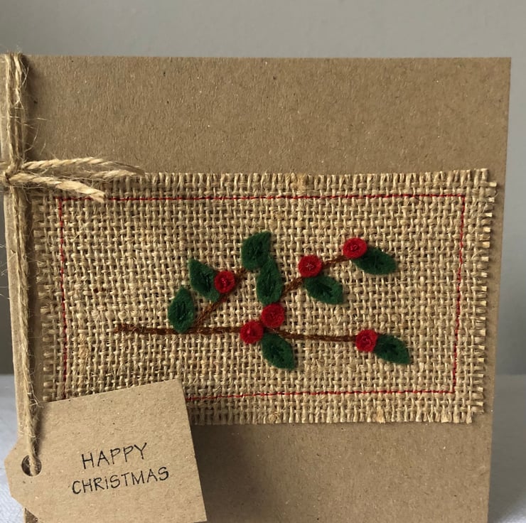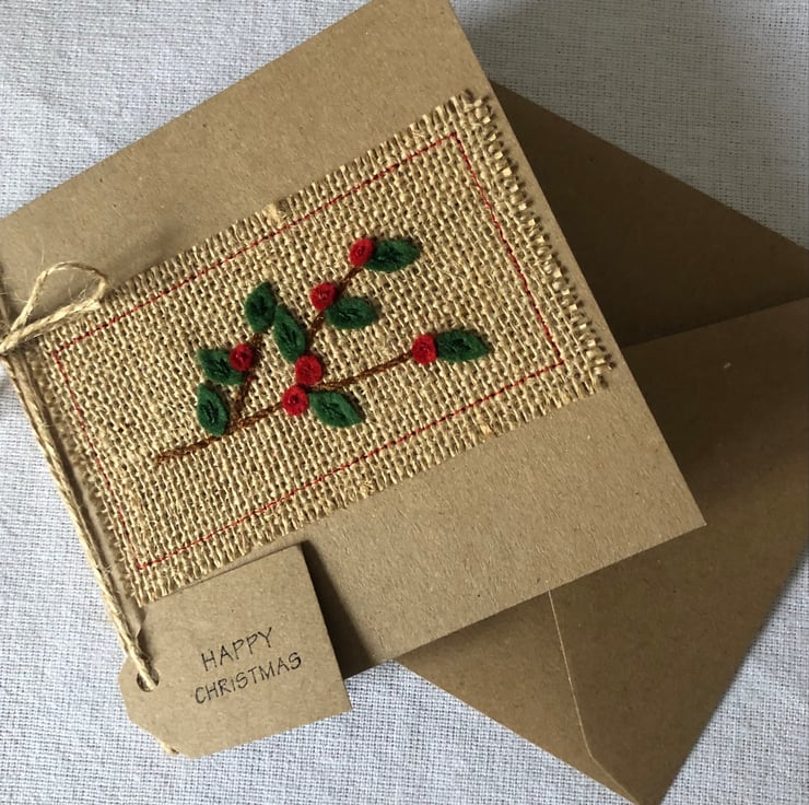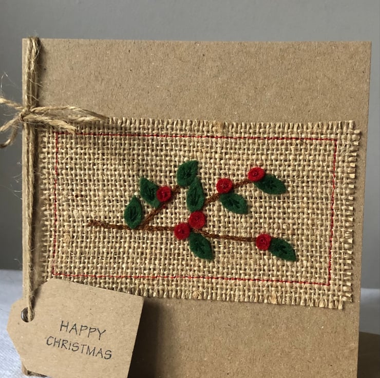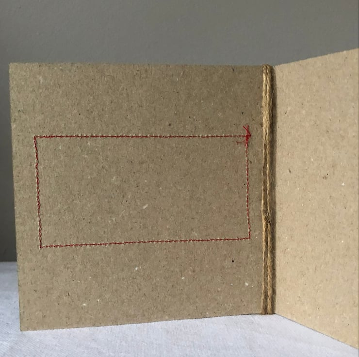 The hessian is machine stitched using a contrasting thread, onto a plain brown recycled card card. This stitching is visible on the inside of the card.