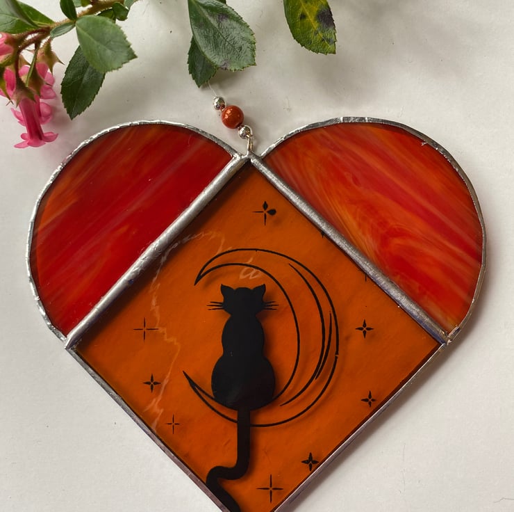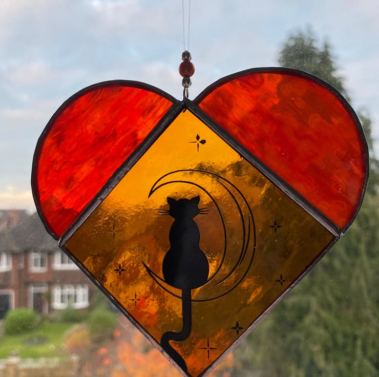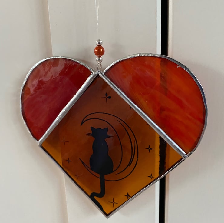 A beautiful 2 tone stained glass heart made using the Tiffany ( copper foiled ) method of stained glass . The main body is a pale amber and the tops a beautiful streaky orange glass .The heart has an image of a cat on the moon which has been screen printed on in black enamel and then fired.