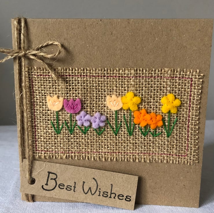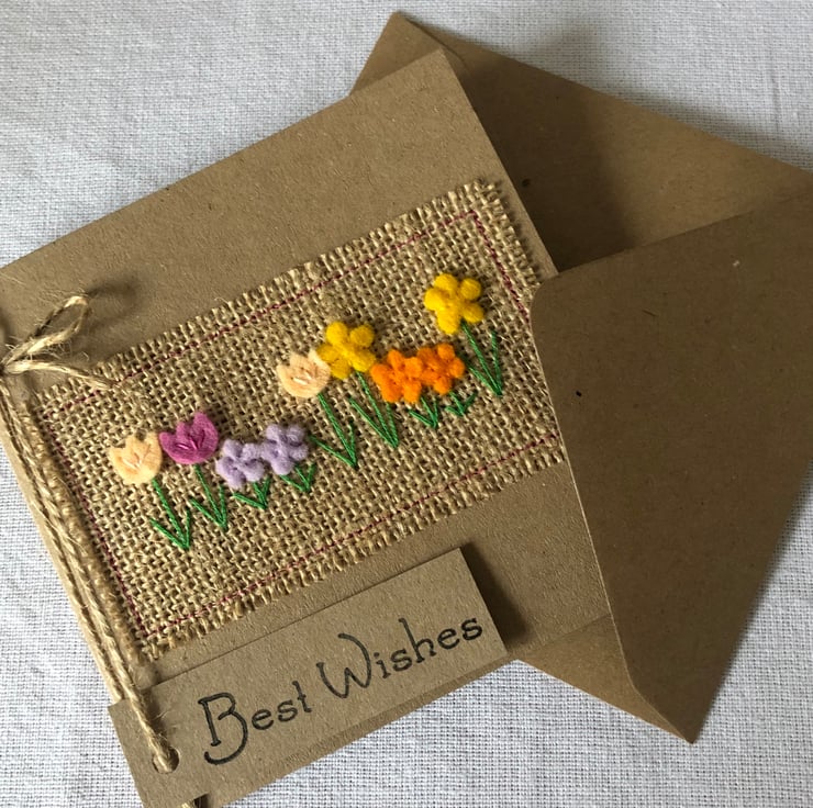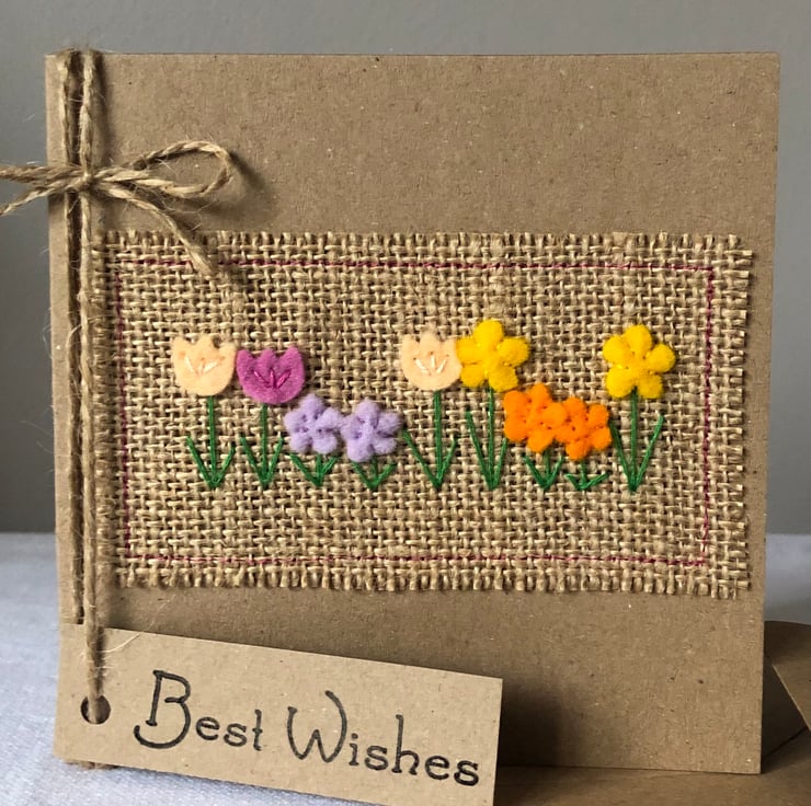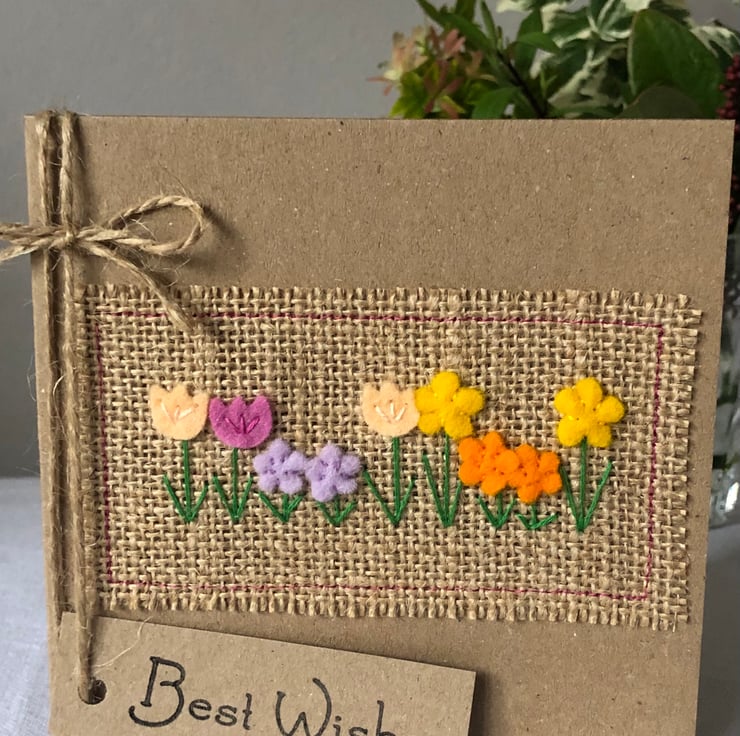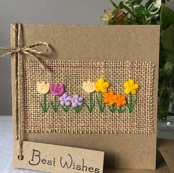 This card is decorated in a row of brightly coloured spring flowers. Hand cut from 100% wool felt and hand sewn to a hessian background.