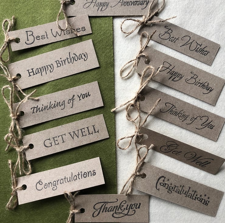 Jute string is wound around the spine of the card and tied in a bow with a greeting added.