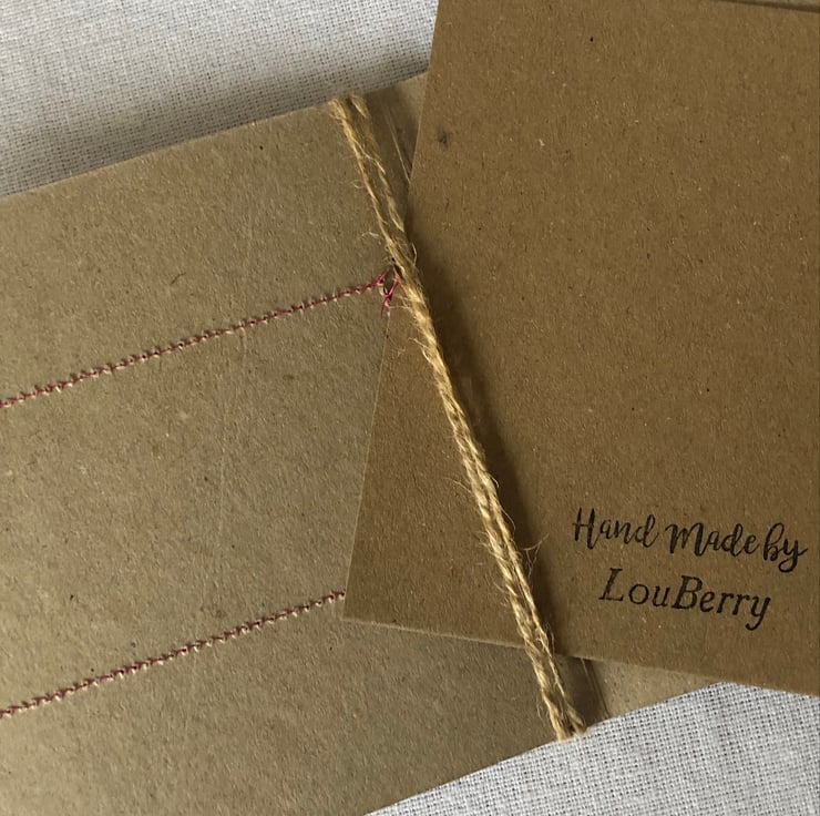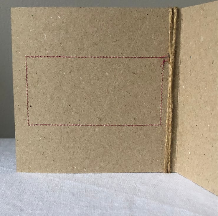 The hessian is machine stitched using a contrasting thread, onto a plain brown recycled card. This stitching is visible on the inside of the card.