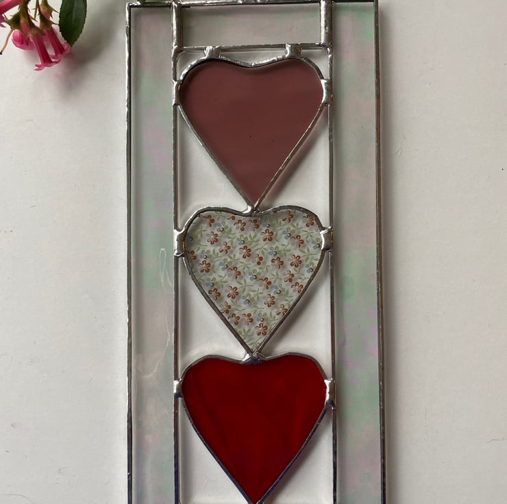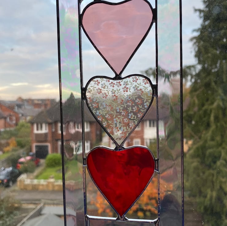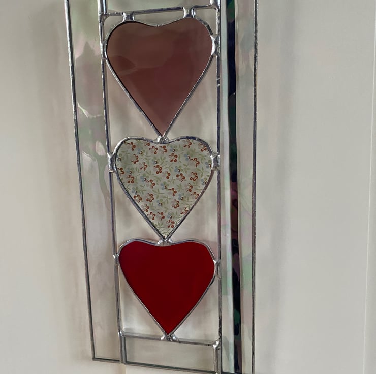 A beautiful stained glass panel made using the Tiffany ( copper foiled ) method of stained glass . It consists of red , pale purple and flowery glass heart surrounded by an iridescent clear border.