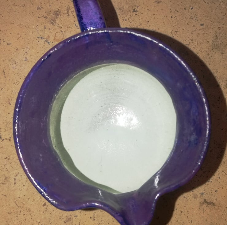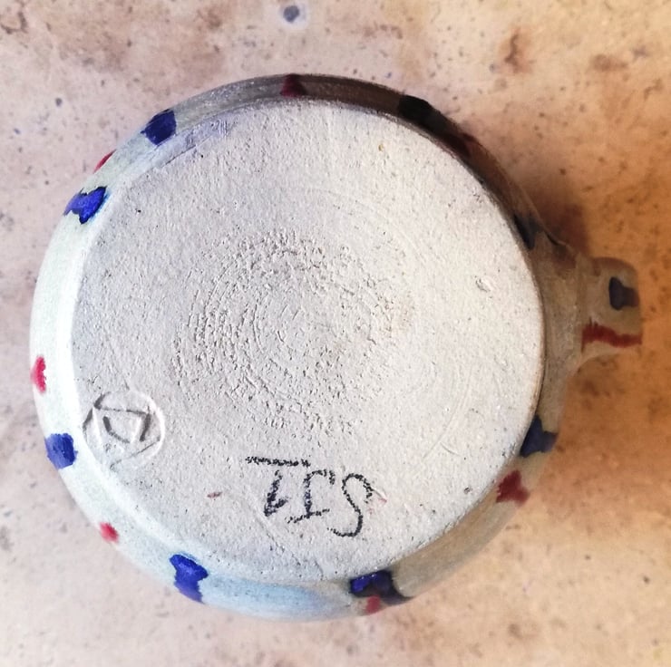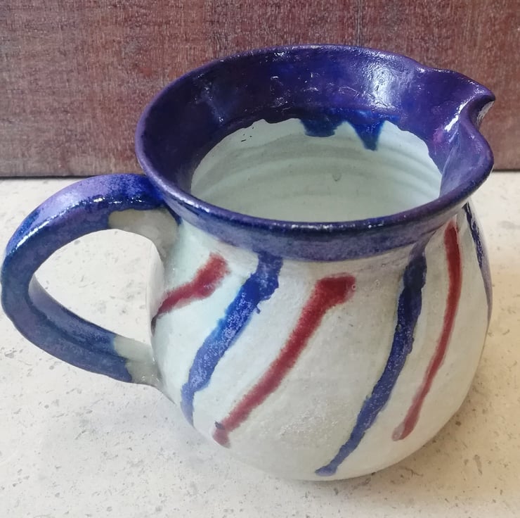 SJ A small stripey jug with white glaze and red and blue glaze lines with white glaze inside.