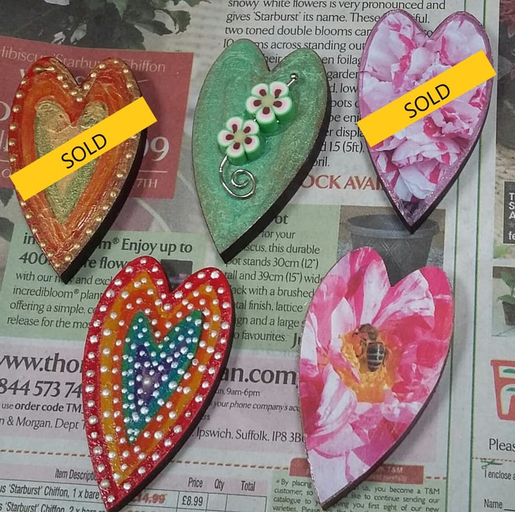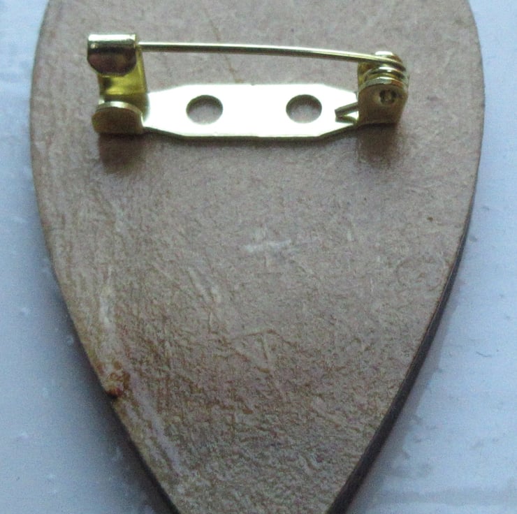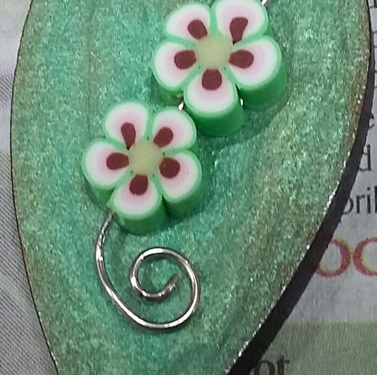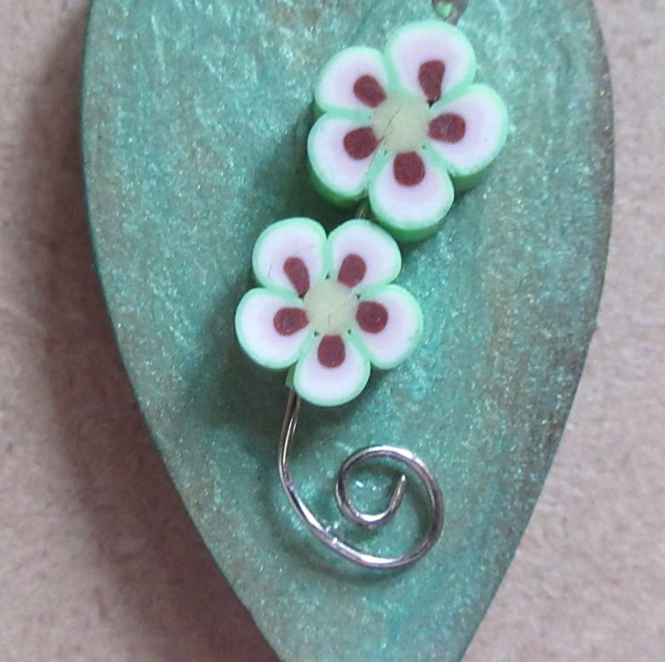 The wood was painted in enamels before the handmade FIMO polymer clay flowers, and metal spiral branch attached. The brooch has been varnished