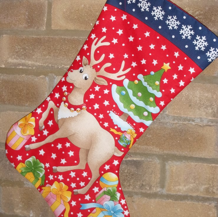 Made from 100% Cotton this stocking has Santa with his sack of parcels that he is putting round the Christmas Tree along with a snowman on one side and on the other side there is Rudolph wearing his collar of bells along with parcels all in front of the Christmas Tree - both on a red background with stars and a navy top border of with snowflakes.