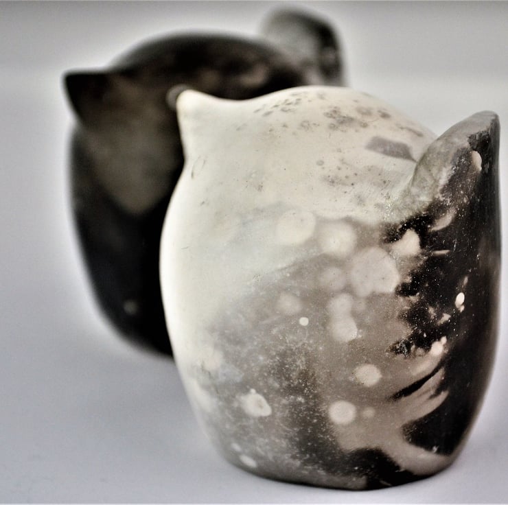 These striking little pottery birds were born in a whirl of flames, they emerged from the ashes of a smoke firing bin with all the flashes and speckles I love from smoke firing.