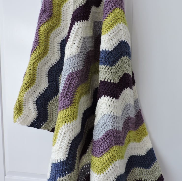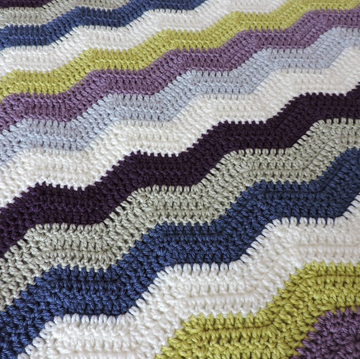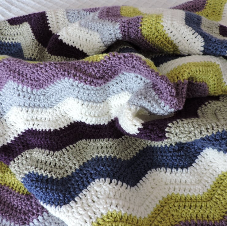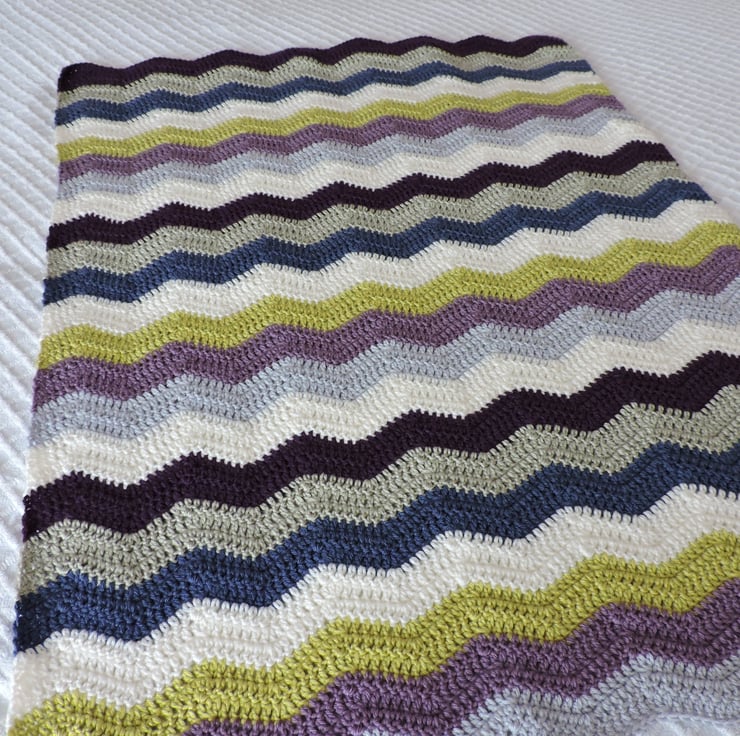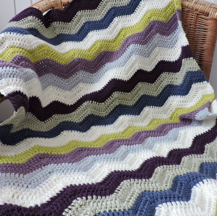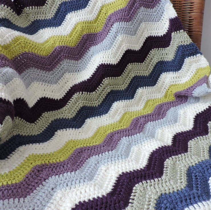 Sale now £14.00 A crochet zig zag blanket which has been made with 100% premium acrylic double knit yarns. Purple, mauve, air force blue, cream. pale sage green, pale grey and lime green. A soft and warm blanket.