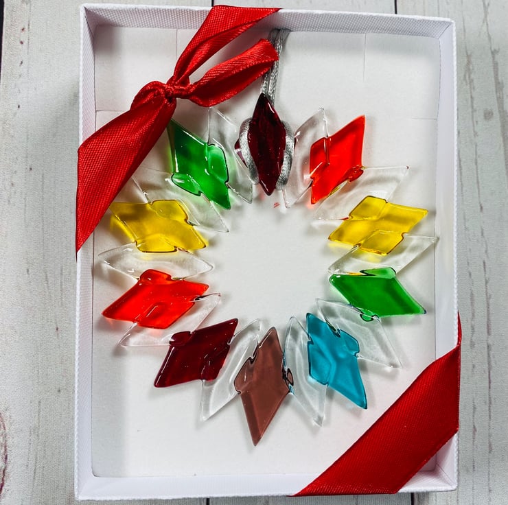 Wonderful wreaths handmade using all the colours of the rainbow . Strung with silver cord and approximately 4 inch diameter . These look stunning on your tree or hanging in a window or mirrors in your home . All of the glass is transparent glass which allows light to travel through it and cast beautiful coloured lights into your room