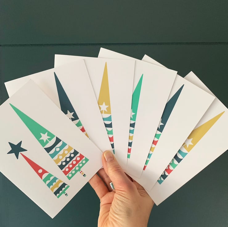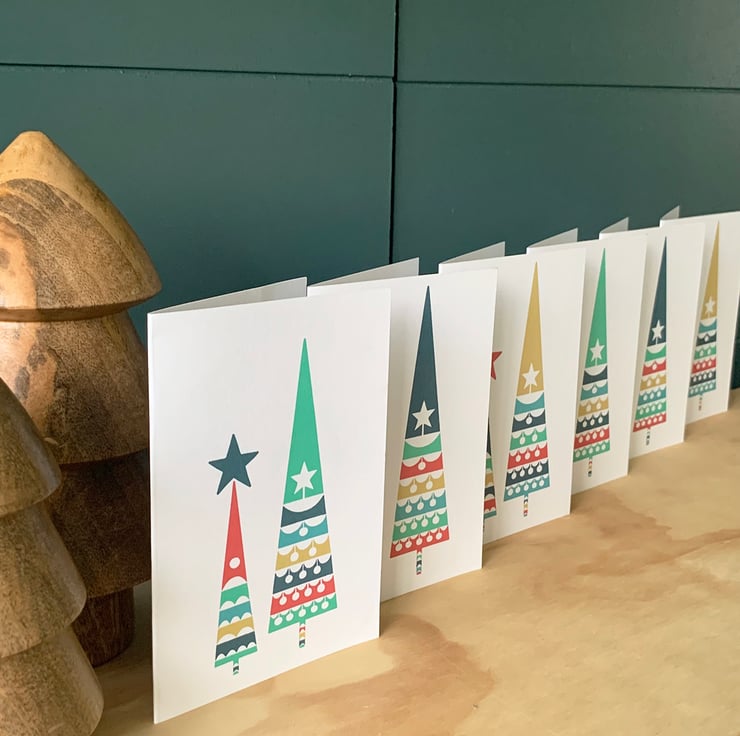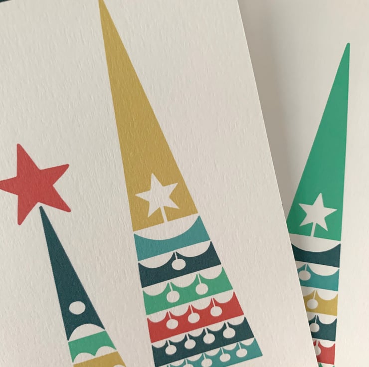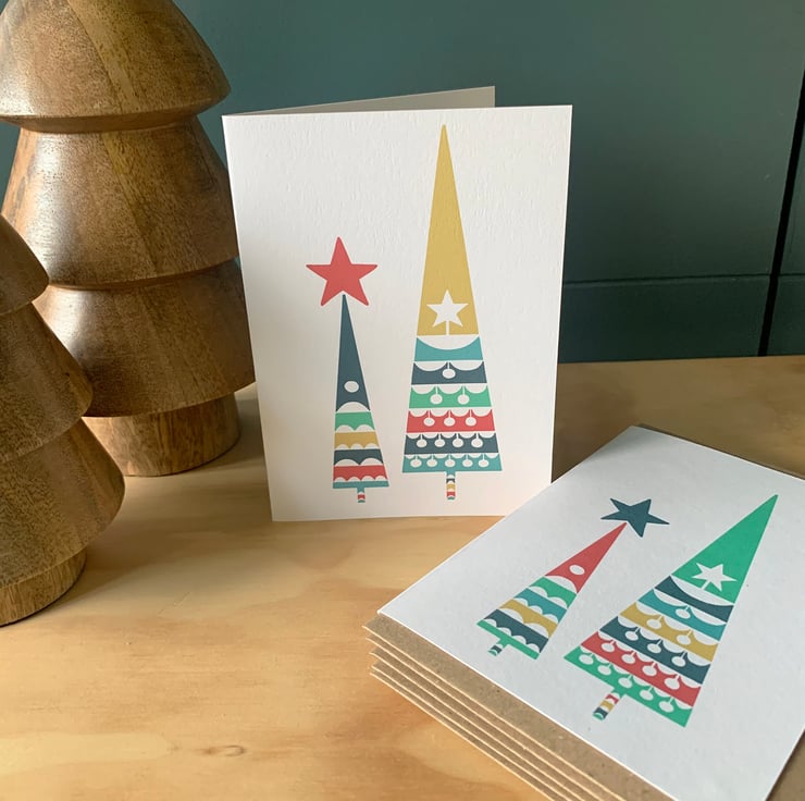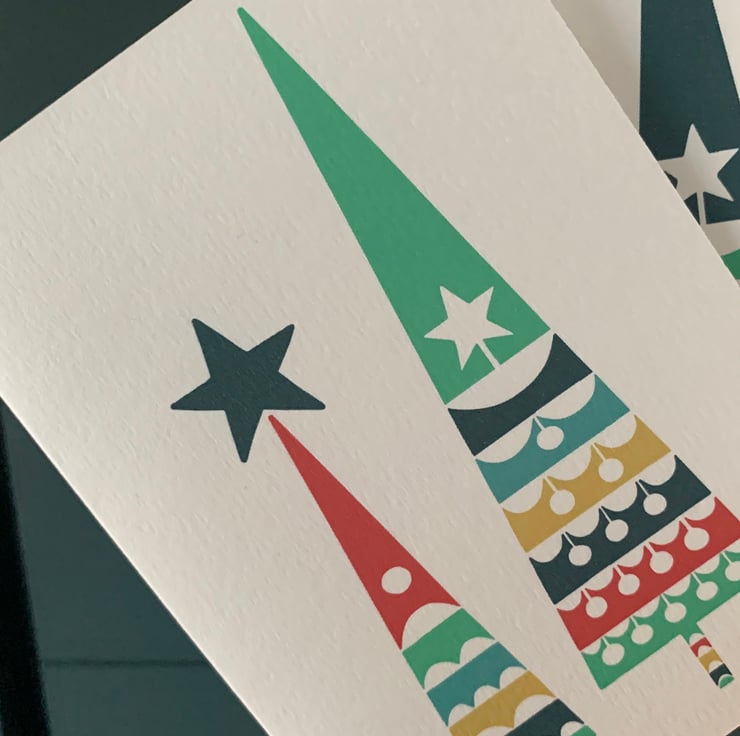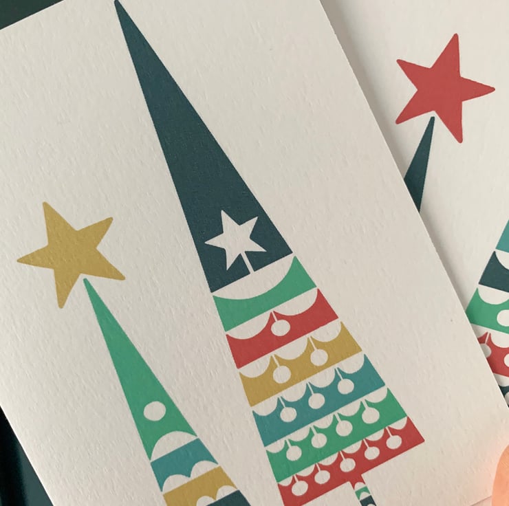 A colourful Scandinavian inspired illustrated pair of Christmas trees with the unique Flowers for Susie mid century colour palette. These cards are sure to brighten up anyone's Christmas.