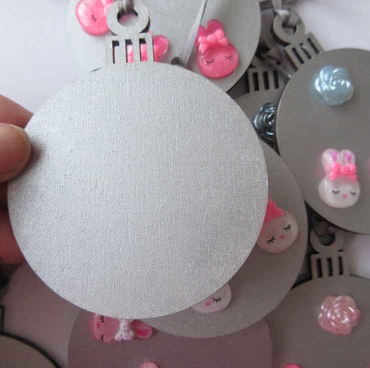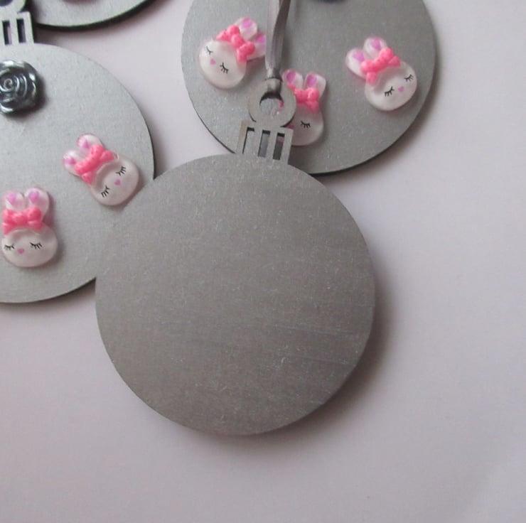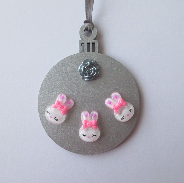 This is a pretty wooden 2D bauble shape, painted in metallic silver, and embellished with 3 resin bunny heads and a resin rose.