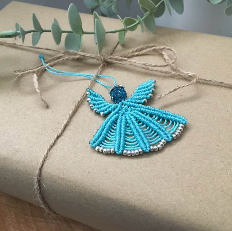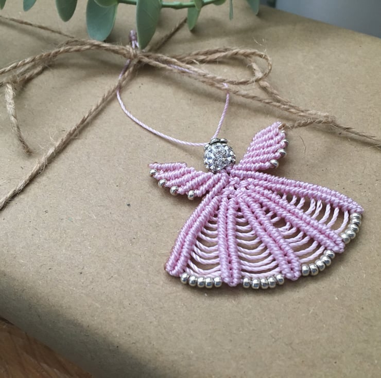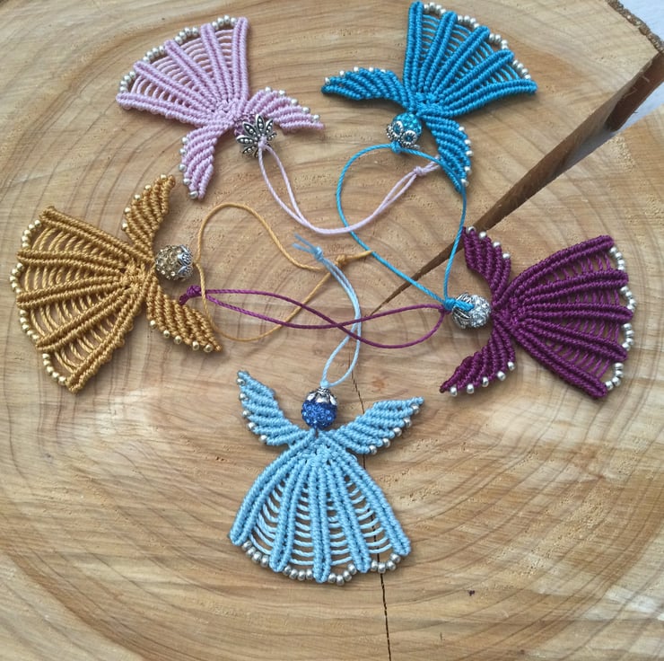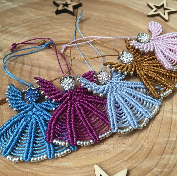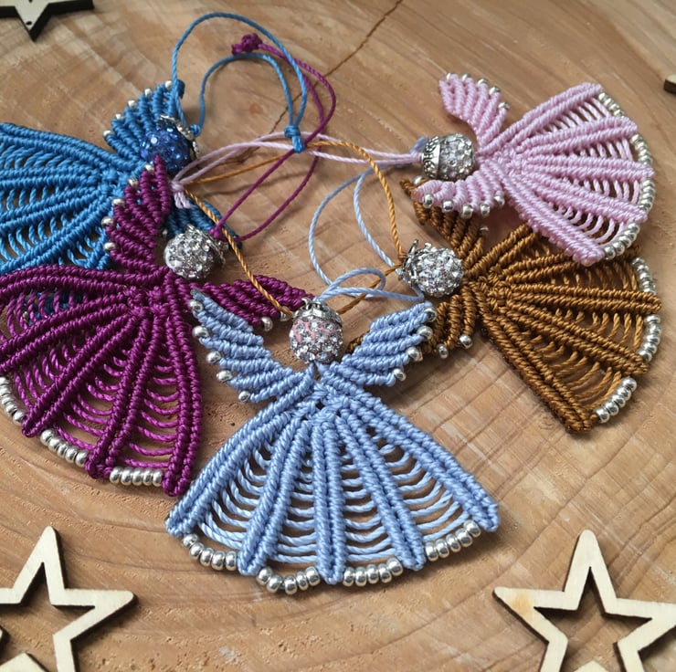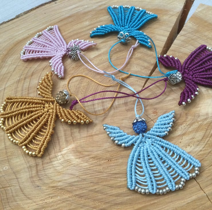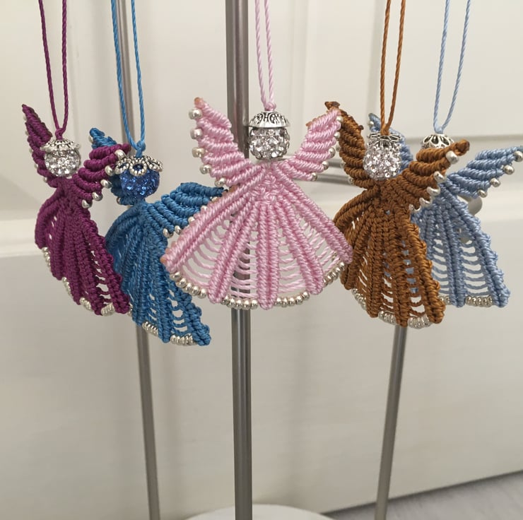 These beautiful micro macrame angels have been hand knotted using the intricate art of micro macrame. Using fine 0.9 mm S Lon strong thread they have been threaded with glass beads to add a touch of sparkle.