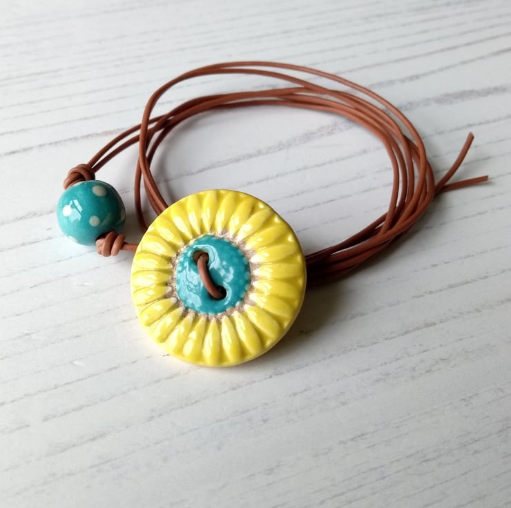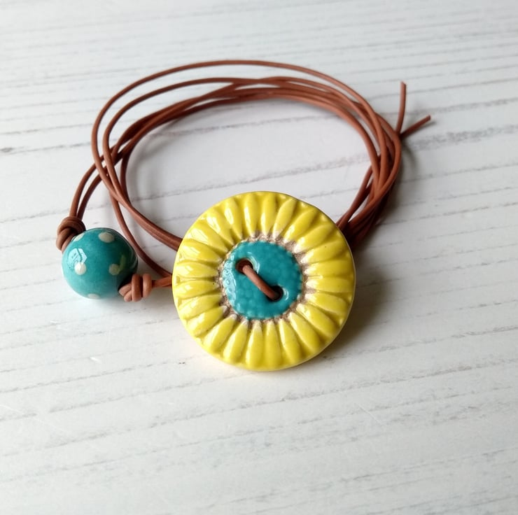 An easy-to-wear vegan-friendly wrap bracelet featuring a ceramic sunflower button and coordinating polka dot bead by UK artisan, Bo Hulley Beads. This listing is for the bright yellow and turquoise version - other colours available in separate listings.