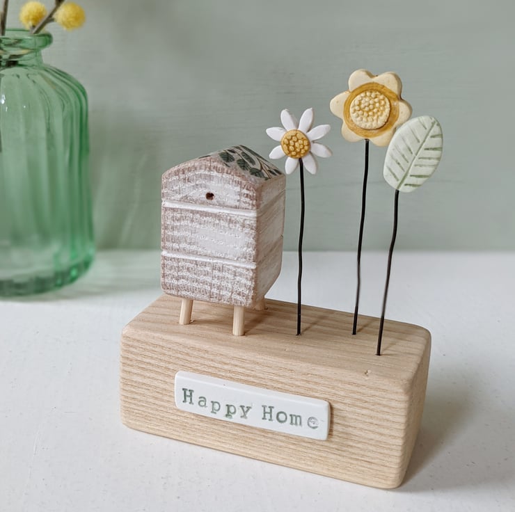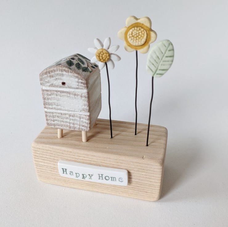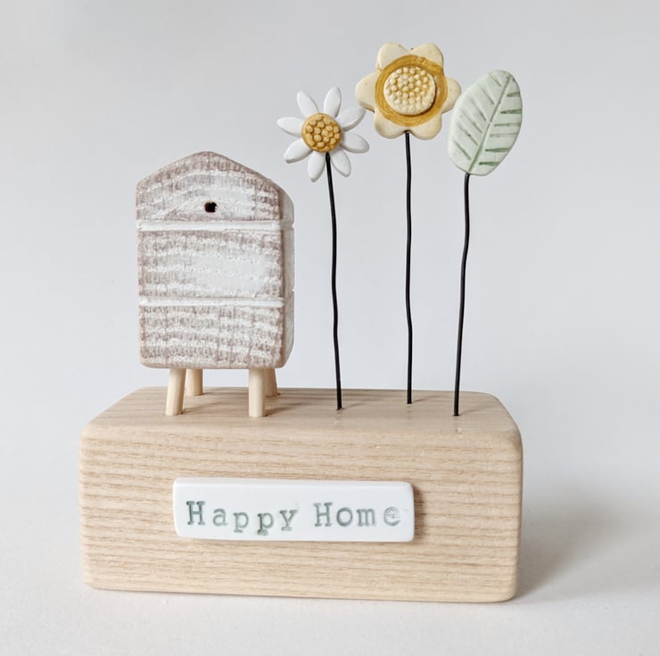 Painted white and sanded smooth it sits on a wooden block with a flower garden. The sign on the front reads 'Happy Home'.