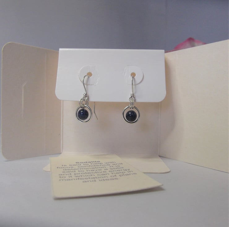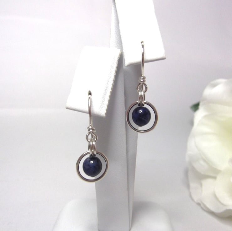 The Sodalite gemstone bead measures 6 mm in diameter & the outer silver ring 8 mm in diameter. The recycled silver handmade ear wires are designed to be comfortable and secure. The overall drop from the ear wire is approximately 12 mm.