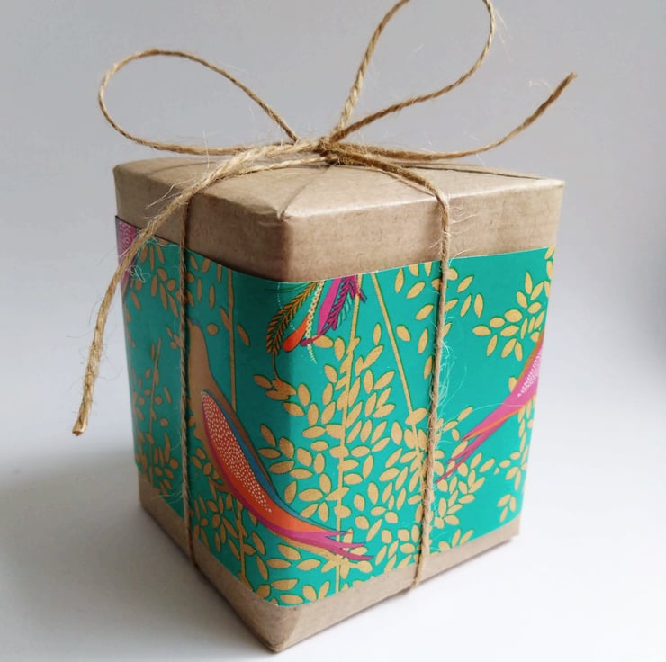 Each comes in a Kraft style gift box with magnetic snap shut lid with a ribbon, snuggled in a bed of natural wood wool.