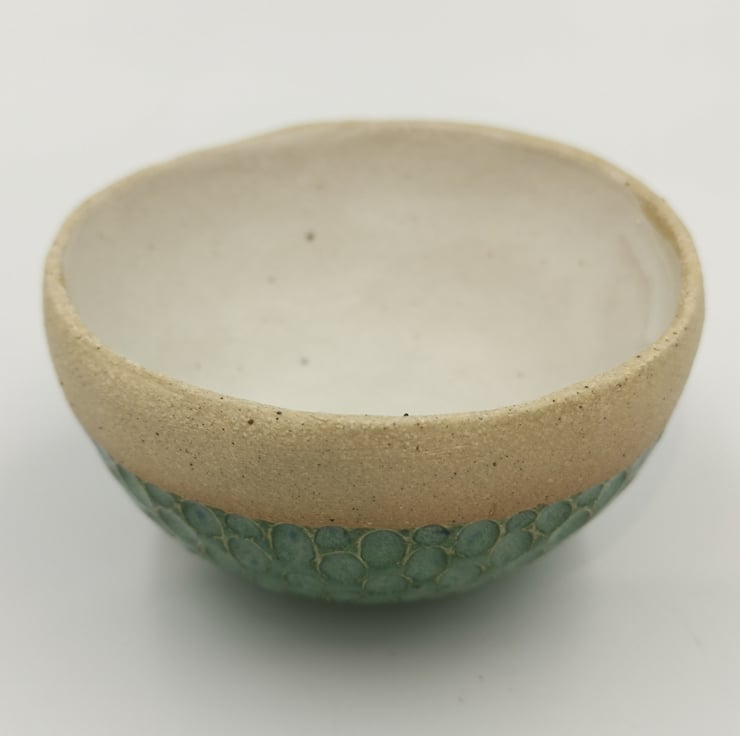 Flecked Stoneware clay, hand carved texture with kiwi green glaze and white interior.