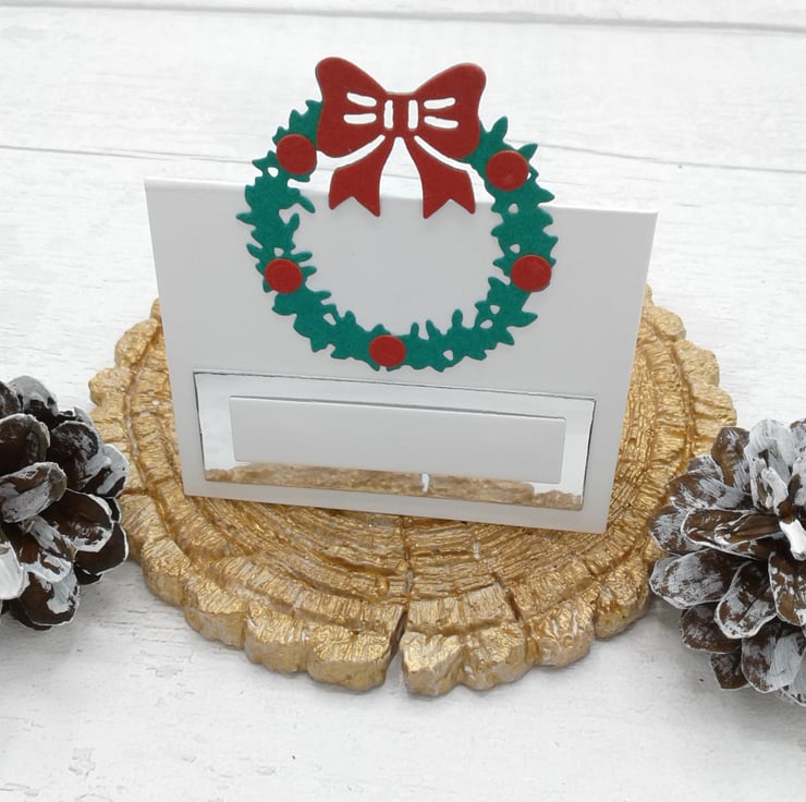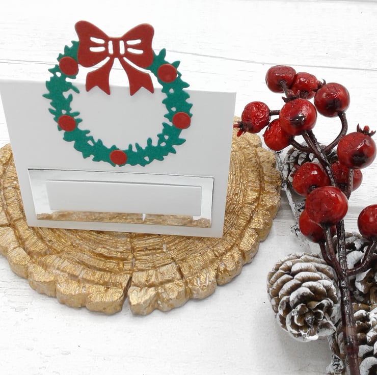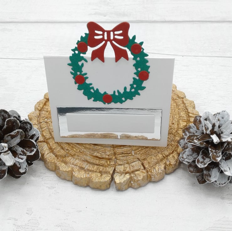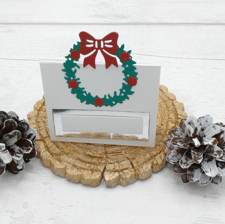 This is a set of 10 white and silver place cards / place settings decorated with a Christmas wreath.