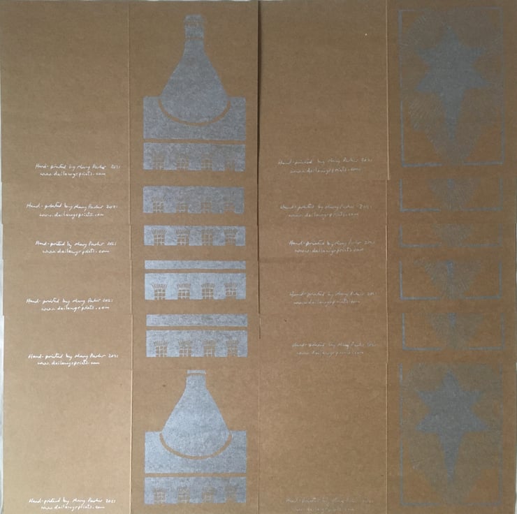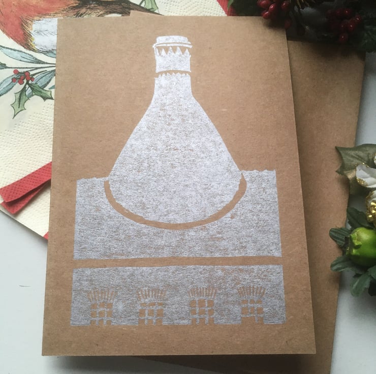 While I was making my Christmas Star cards, I wondered if any of my Bottle Oven linocuts would also work in silver, so I looked through the plates and found this one, which was never cut back to the fine detail as I only did the first two colours (my original Heron Cross Pottery linocut is listed in my shop). I'm glad that it has worked! It's an original design, drawn, cut out and printed by hand in my kitchen. It is not a limited edition (unlike many of my linocuts) so if it sells out there should be more available soon :)