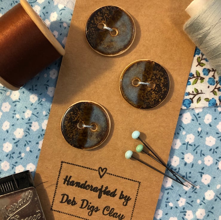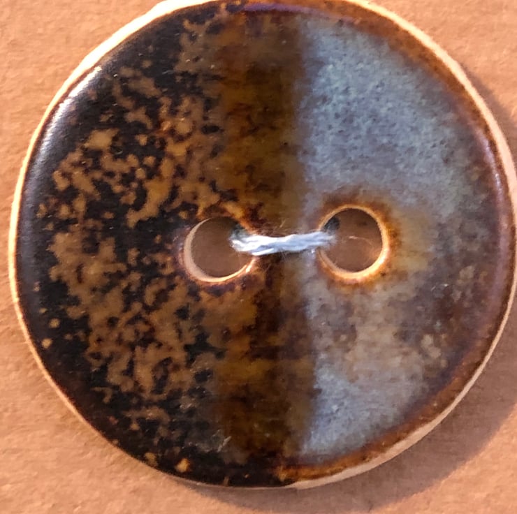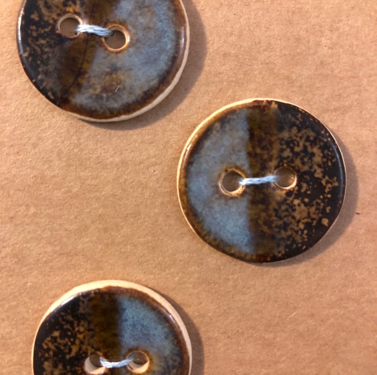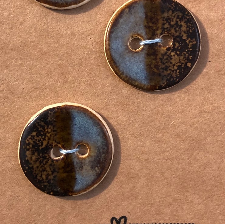 These round buttons were handcrafted and fired in my small home studio. They were glazed with two different glazes and slightly overlapped to produce a ‘half and half’ effect with a subtle stripe down the middle. One side is a speckled brown colour and the other is rutile blue. As each individual button is handcrafted, no two buttons will be exactly the same.