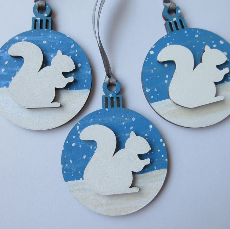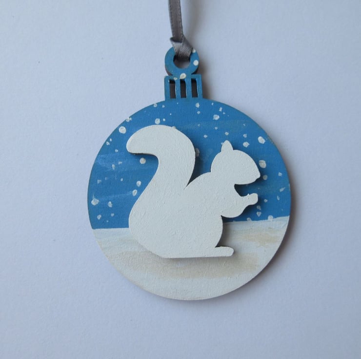 A hand painted wooden bauble shape, hand painted and embellished with a wooden squirrel shape which has been painted white.