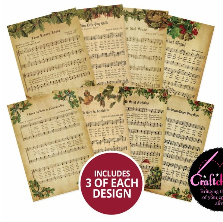 Adorable Scorable Pattern Pack – Christmas Melodies features a vintage styled music paper with elements of Victorian embellishments including holly, bells, a bird and santa. This pack is printed onto matt-tastic in relation to the theme to enhance the beautiful vintage style so they can be inked, torn and distressed. This pack includes stunning notes of colour throughout the designs including: vintage beige, holly green and deep red – perfect for male and female recipients. This versatile cardstock will add a real stand-out touch to crafters’ makes, whether that is for backgrounds, matting and layering, box-making and more! Distress even further by being torn or with the use of inks.