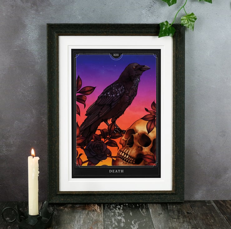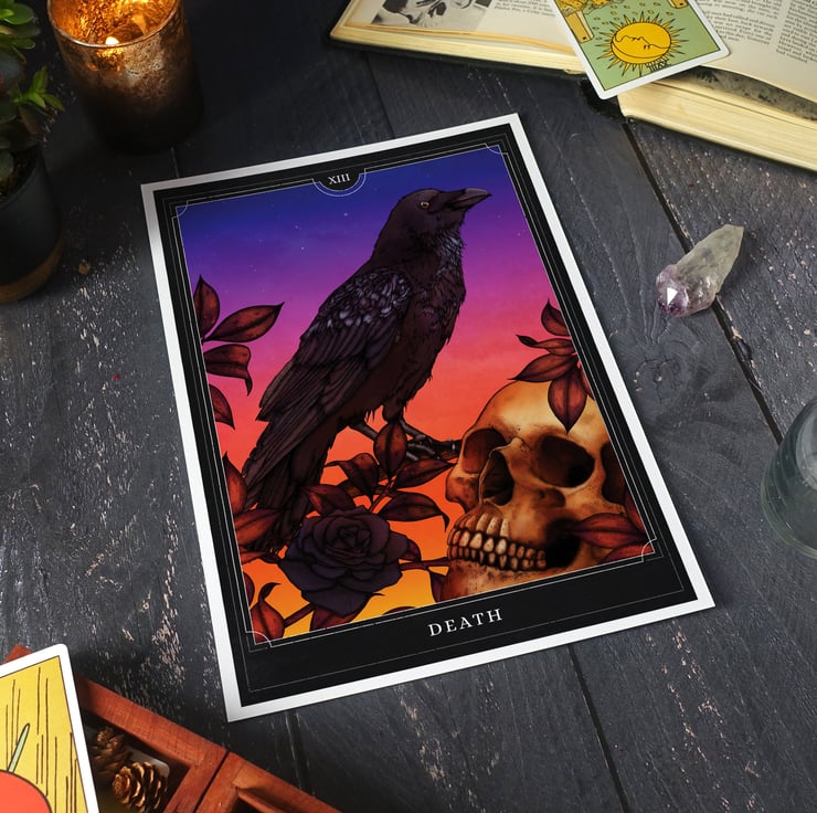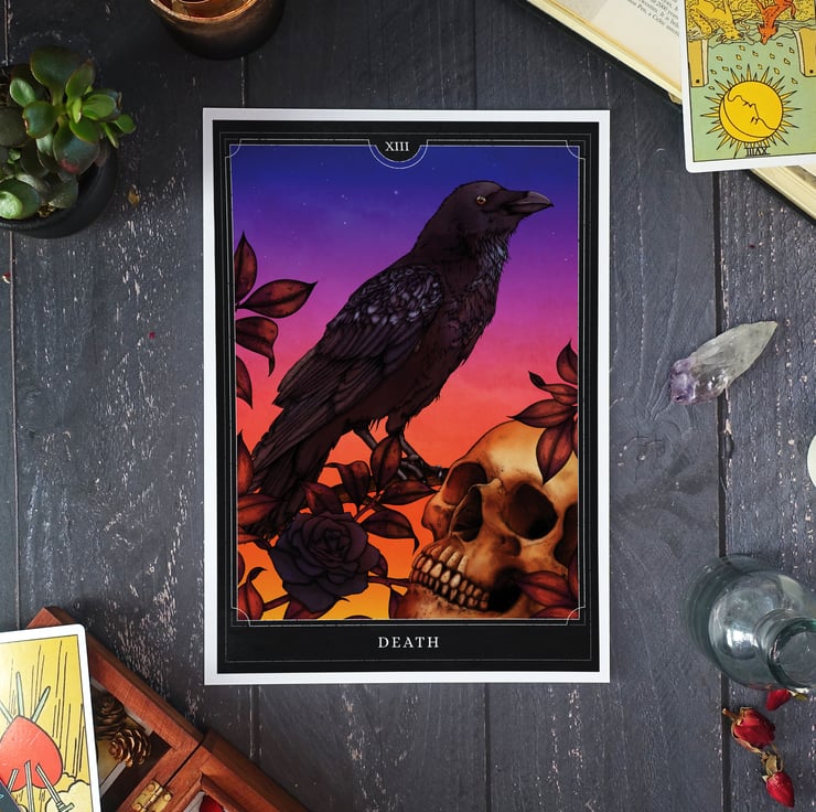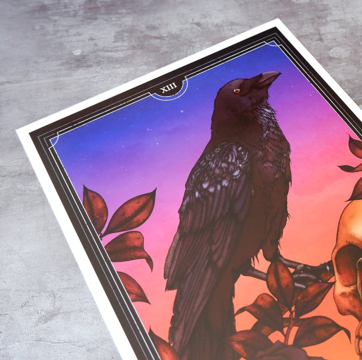 A beautiful tarot card giclée art print of ‘Death’, inspired by much of the occult symbolism present in traditional tarot card artwork. The illustration features a raven, skull and sunset and represents changes, endings and beginnings and the cyclical nature of life and death.