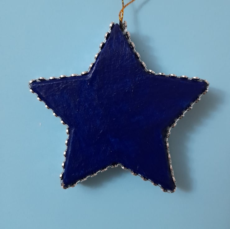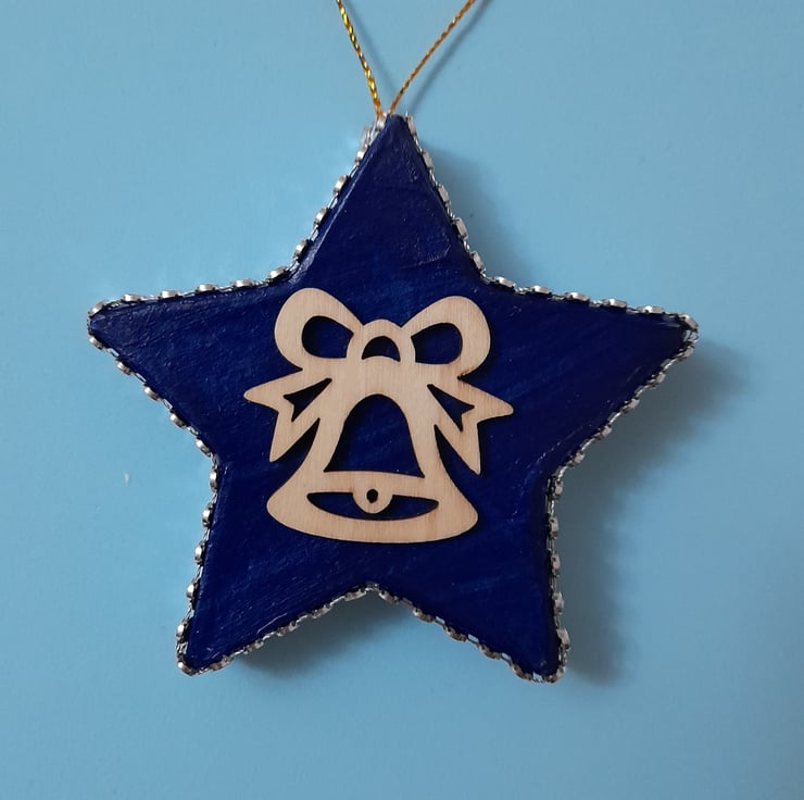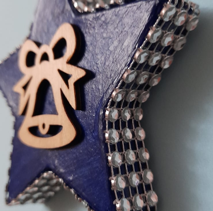 Paper mache bauble decorated with acrylic paint, acrylic bling and wooden christmas Bell.