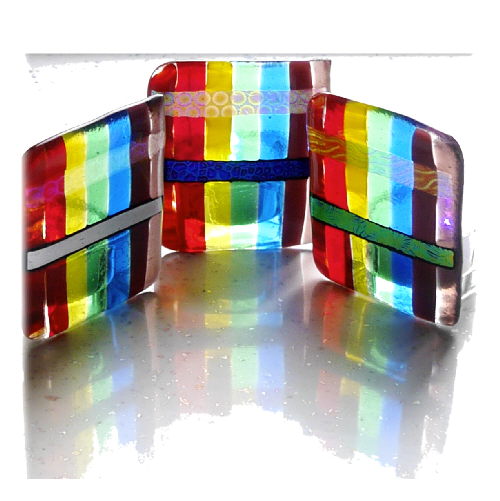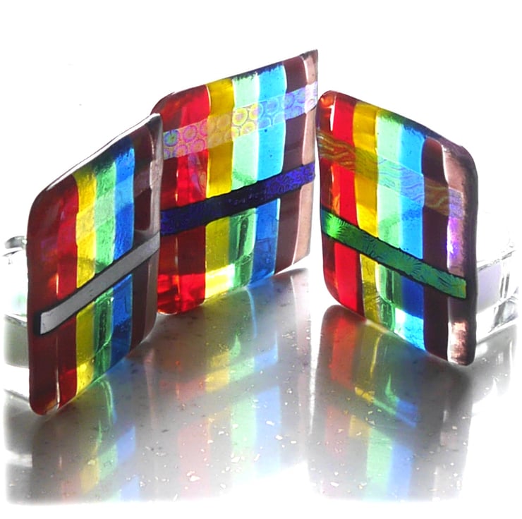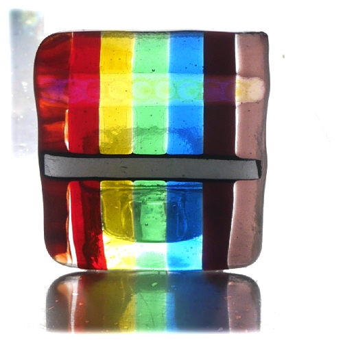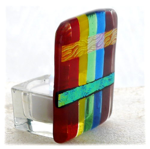 I've made a vibrant vertical striped design on the candle front panel in the 7 colours of the rainbow. I've then added 3 horizontal stripes of precious dichroic glass, 1 stripe black backed dichroic so opaque, the other two clear backed dichroic so transparent. This gives the candle holder a really luxurious finish.