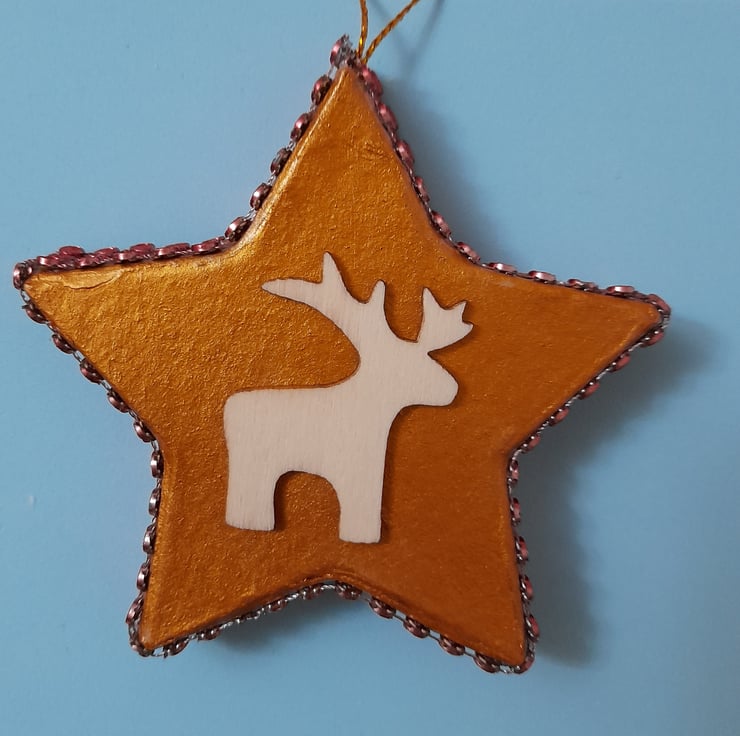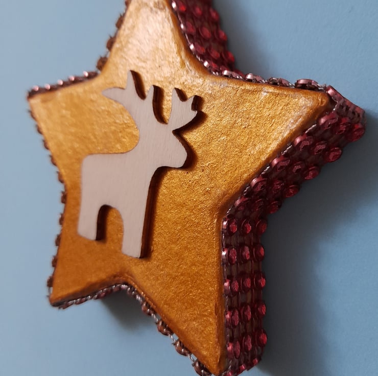 Paper mache bauble decorated with acrylic paint, acrylic bling and wooden christmas reindeer.
