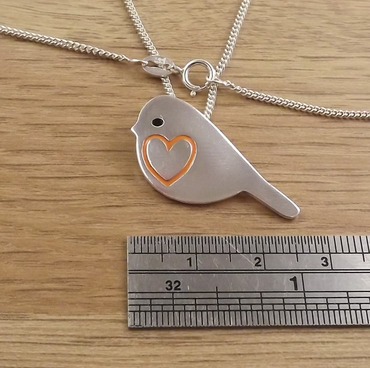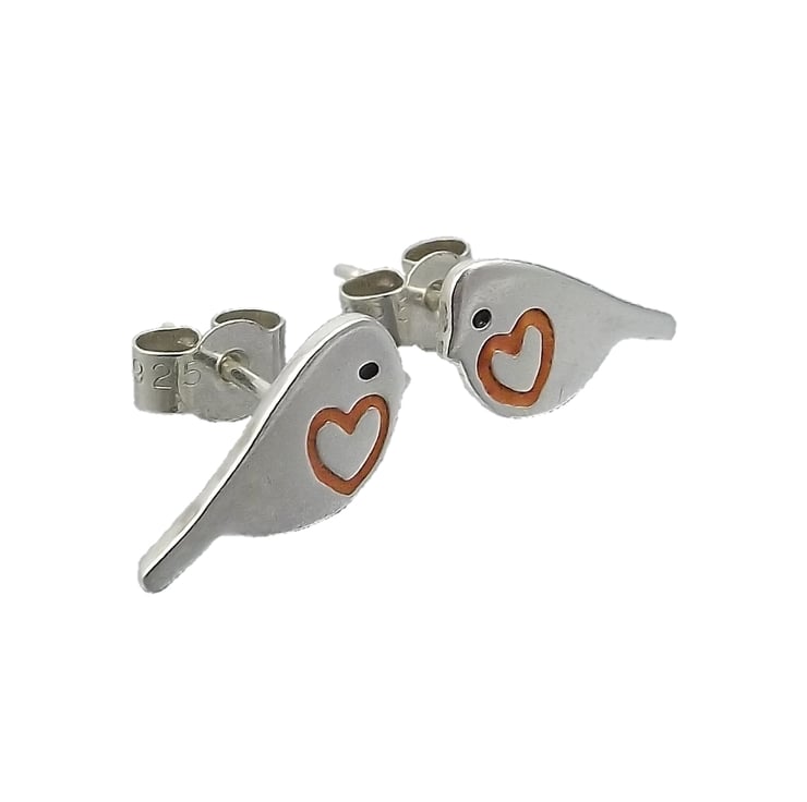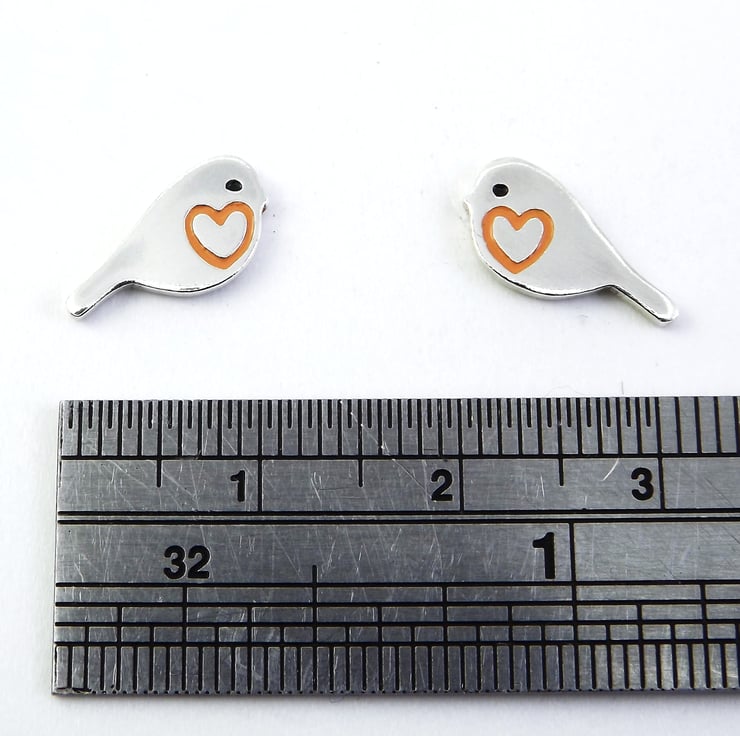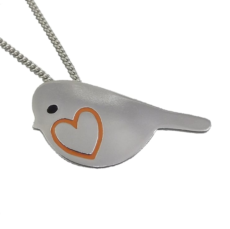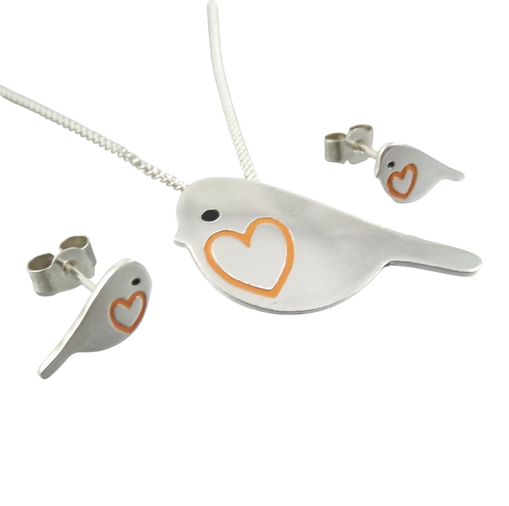 This robin jewellery set includes a pendant and a pair of stud earrings which have been lovingly crafted by hand. They are made from recycled sterling silver and are etched before being cut out with a piercing saw, the edges are then smoothed using files and emery paper before they're carefully given their shape using a punch and hammer. Pins are then added to the back of the earrings. Black and orange resin based enamels are added to the etched areas before they are polished. They come in a box made from 80% recycled cardboard.