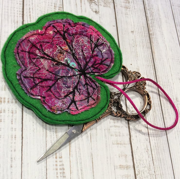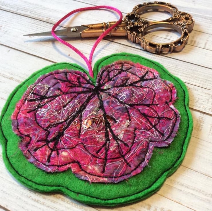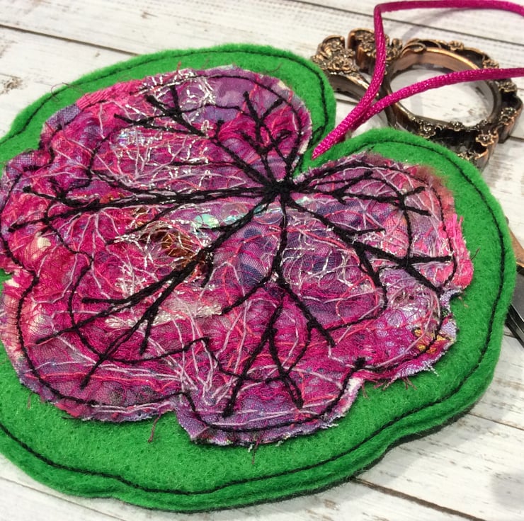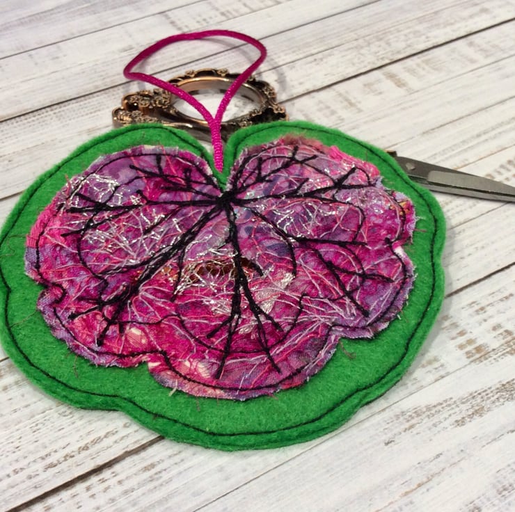 This embroidered Leaf decoration has been made with my own handmade up-cycled fabric. This dramatic pink fabric contains wool, threads, cottons, sequins and organza netting etc. and is enhanced with free motion embroidery. It’s perfect for a season greetings, Christmas tree decoration, house warming gift or to decorate your home. It comes with a pink cord and is backed in green felt. The leaf measures 9 x 10cm approx. With the cord it’s length is 17cm.