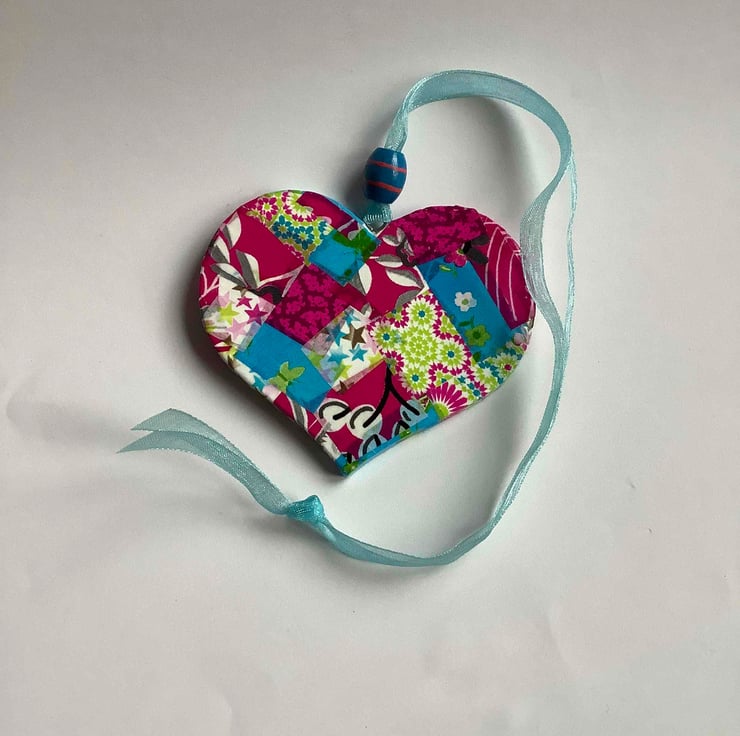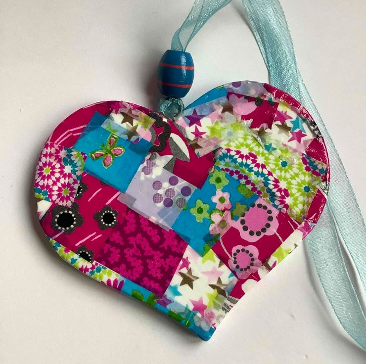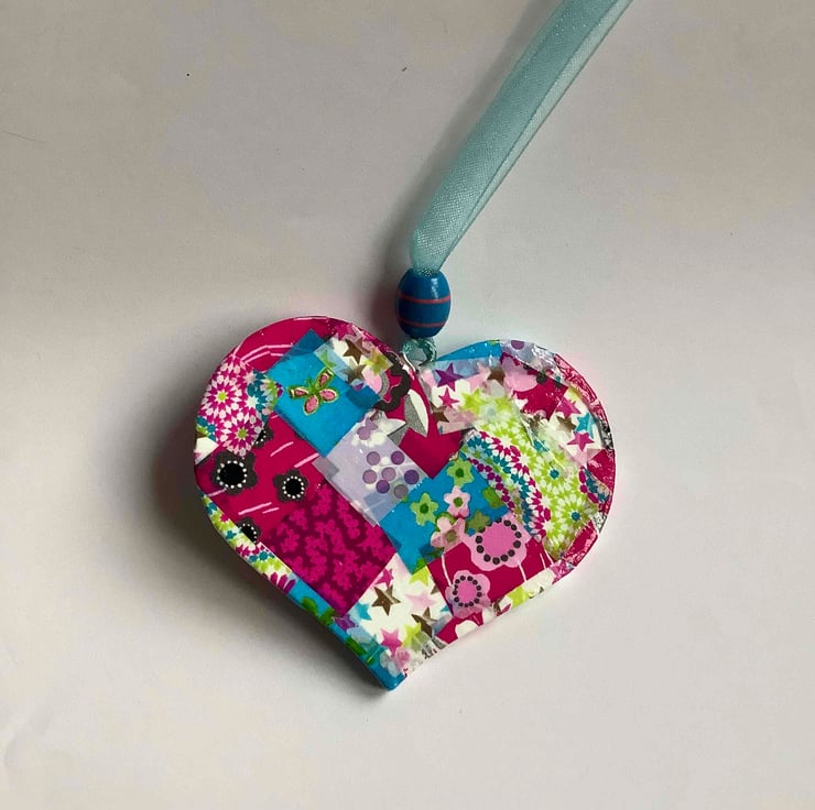 This wooden heart has been decopatched and varnished. Pink,blue,green and white are the main colours
