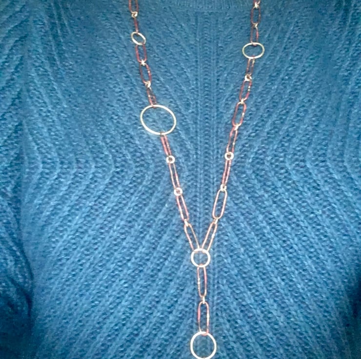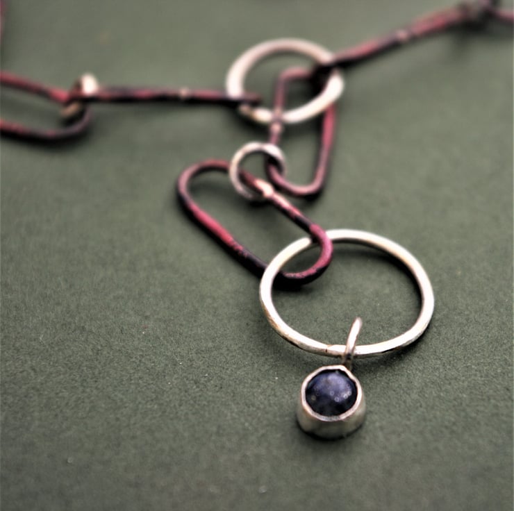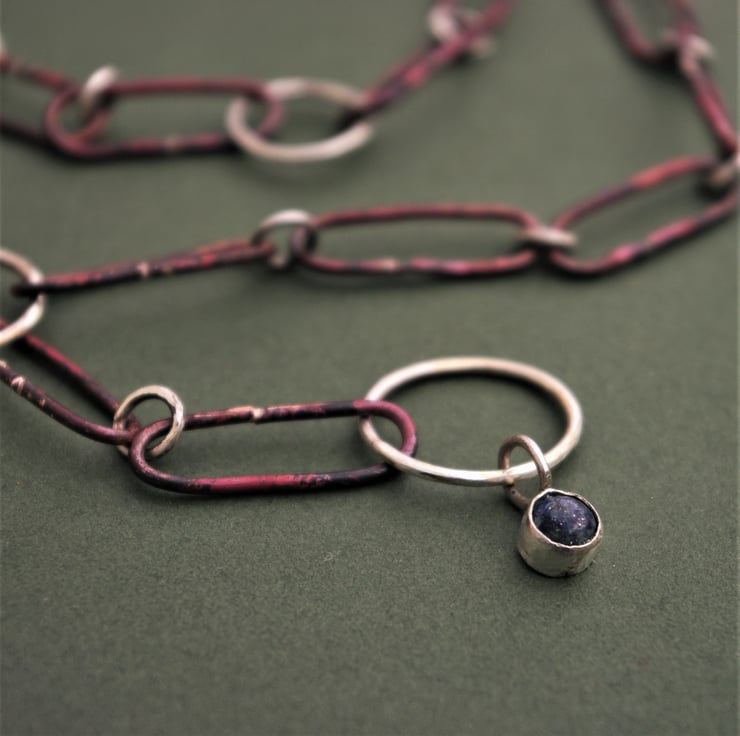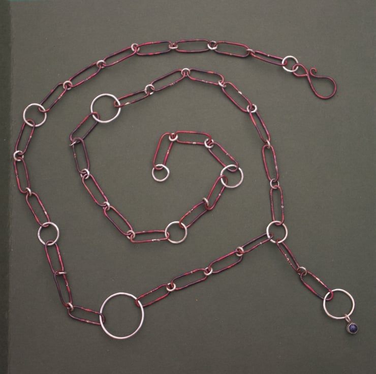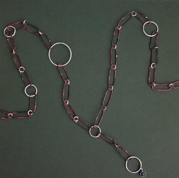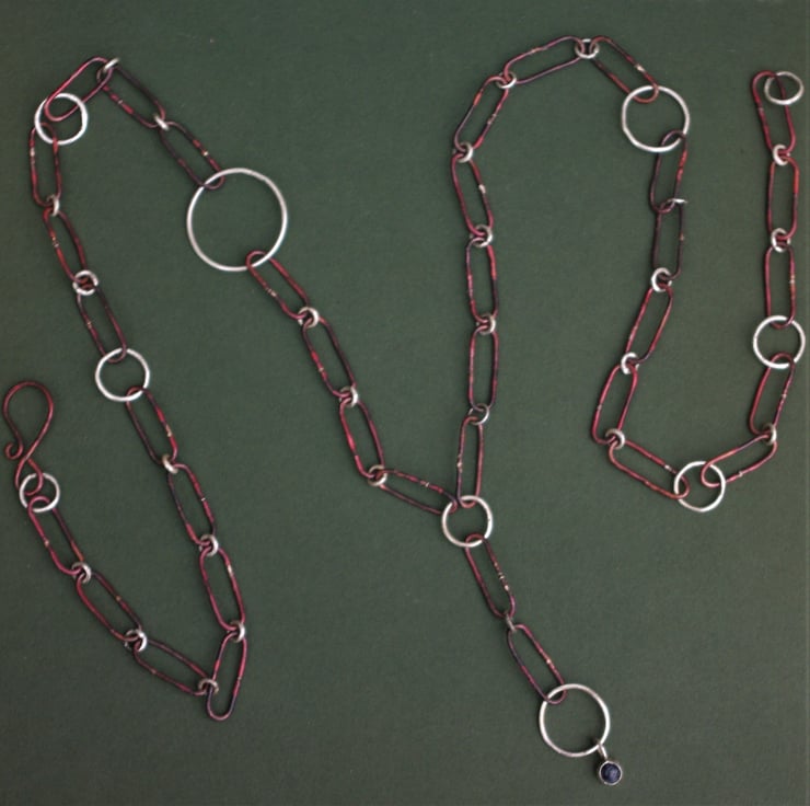 85cm length chain using copper and eco silver. All links are soldered closed. The dark red tones on the copper have been achieved with heat.