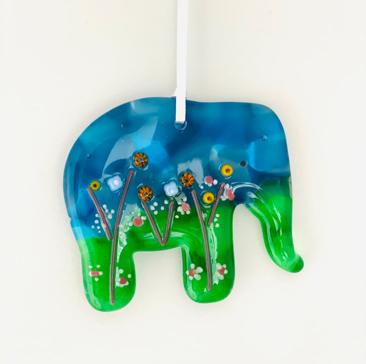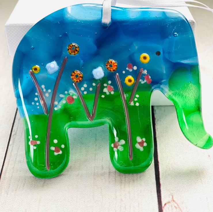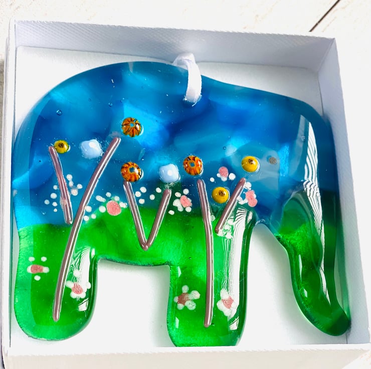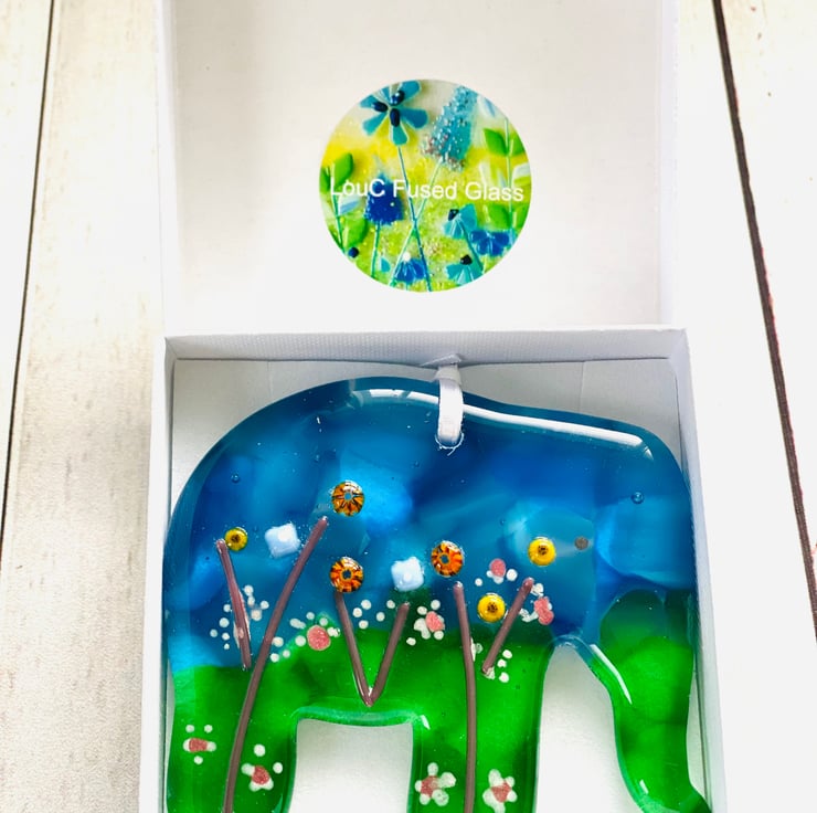 Gorgeous handcrafted fused glass elephant in a gift box . The elephant is approximately 4 inch diameter and 1/4 inch thick . Each is totally unique and created over 2 kiln firings then drilled and strung with satin ribbon . Very popular and one of my best sellers in the gift range .