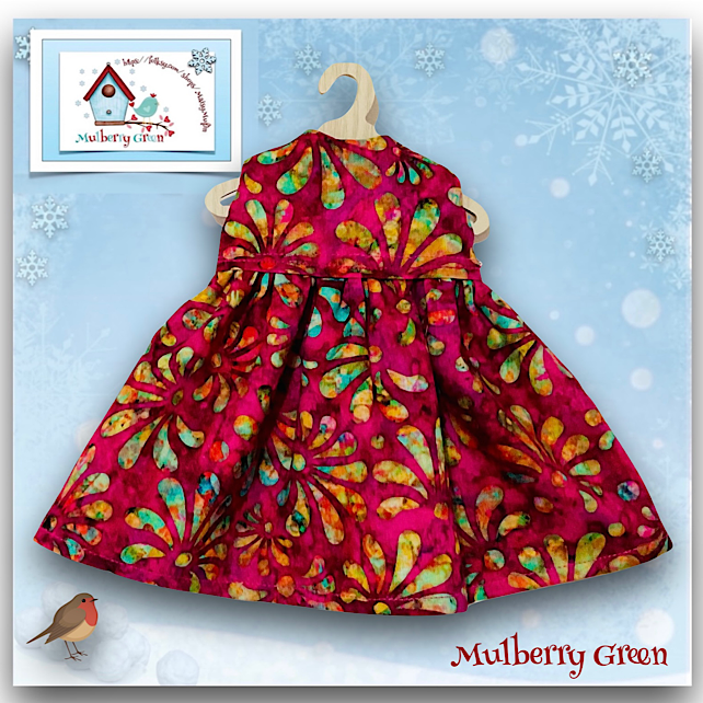 A gorgeous little dress in jewel bright colours, to fit the Mulberry Green dolls. The dress has a lined bodice and a gathered skirt. It is made from best quality cotton.