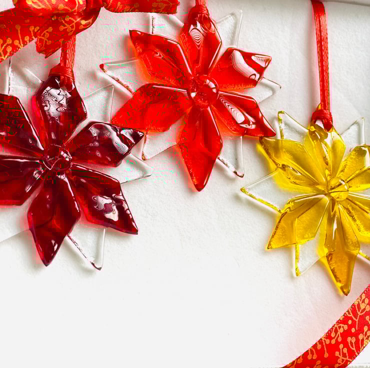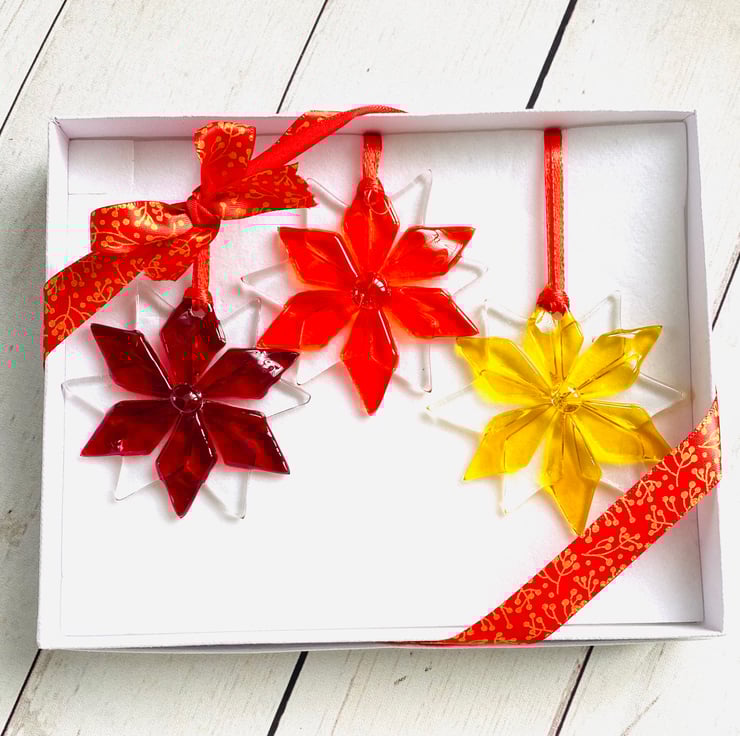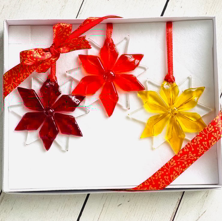 Three gorgeous hand crafted snowflake decorations presented in a white gift box. A lovely Christmas gift for someone special . Each Christmas decoration is approx 3 inch diameter and they are warm colours (cool colours also available ) . Such pretty handmade decorations . All of the glass is hand cut and fired in my kiln