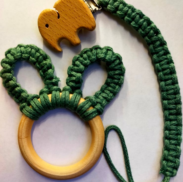 Sage green dummy clip and teething ring ( greens alot softer in real life)