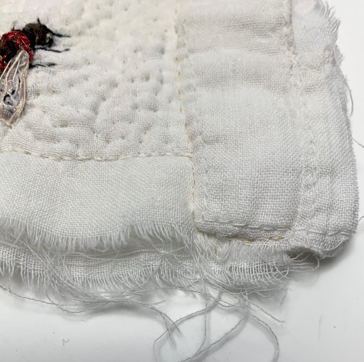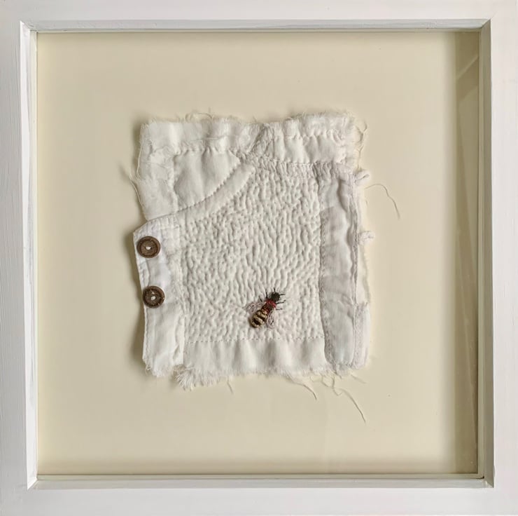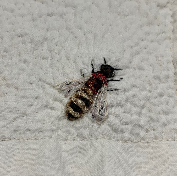 Therefore, for the next stage of its life, I soaked it before washing it, then repaired the bee, ripped the fabric and re stitched it into this artpiece.