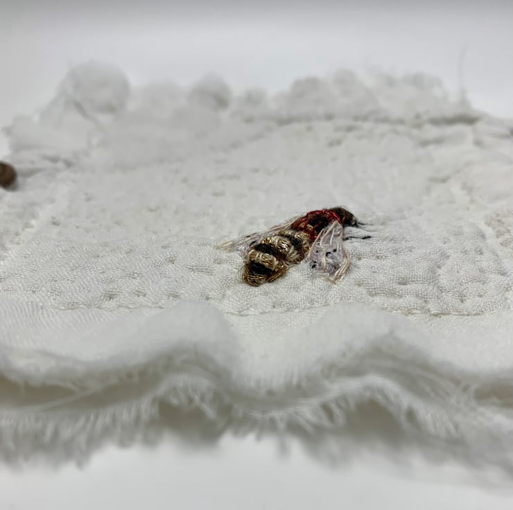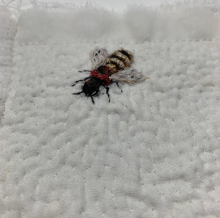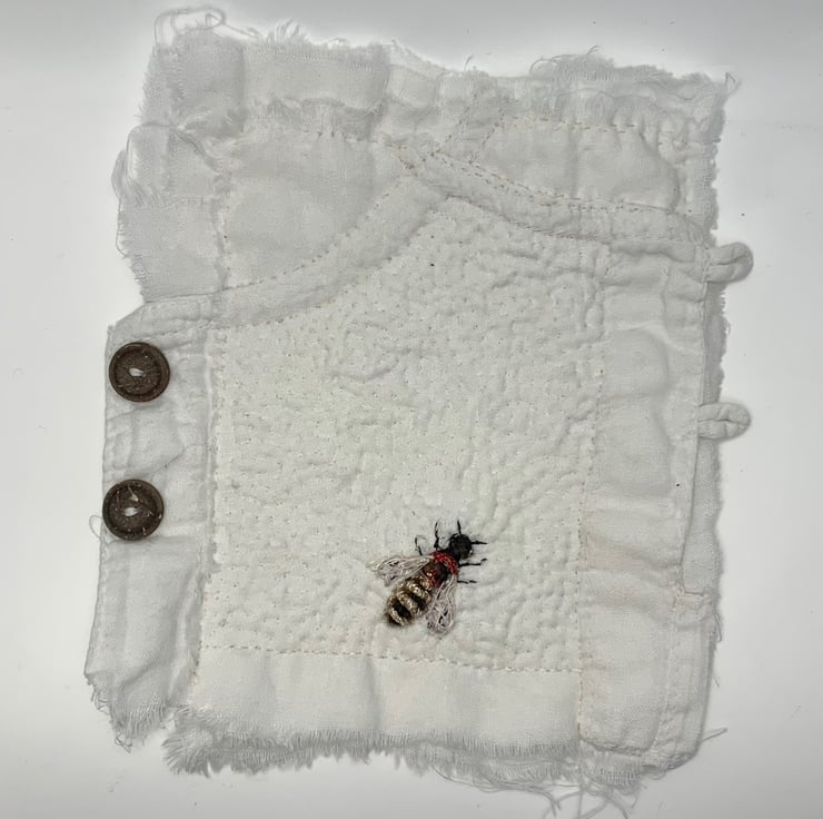 For the next stage of its life, I soaked it before washing it, then repaired the bee, ripped the fabric and re stitched it into this artpiece.