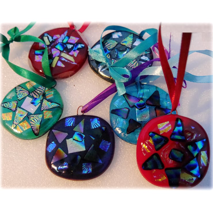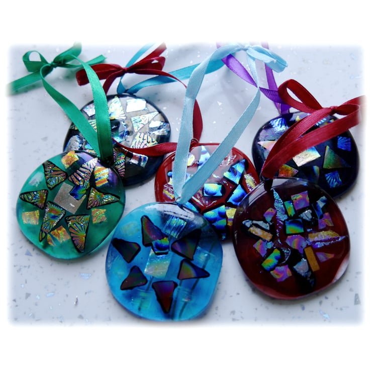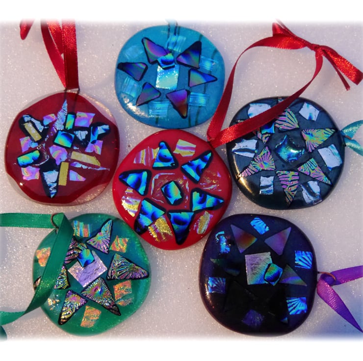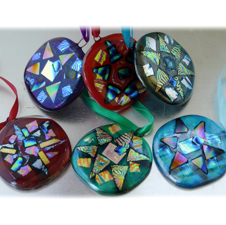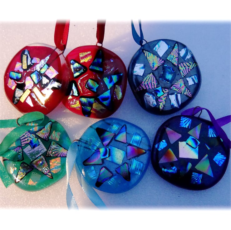 Each has a generous star decoration cut from different types of dichroic glass and hangs from a matching coloured ribbon. They are very sparkly as the dichroic glass is very special and has lovely shimmery colour change properties.