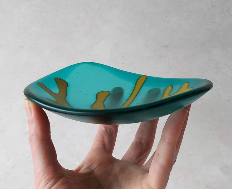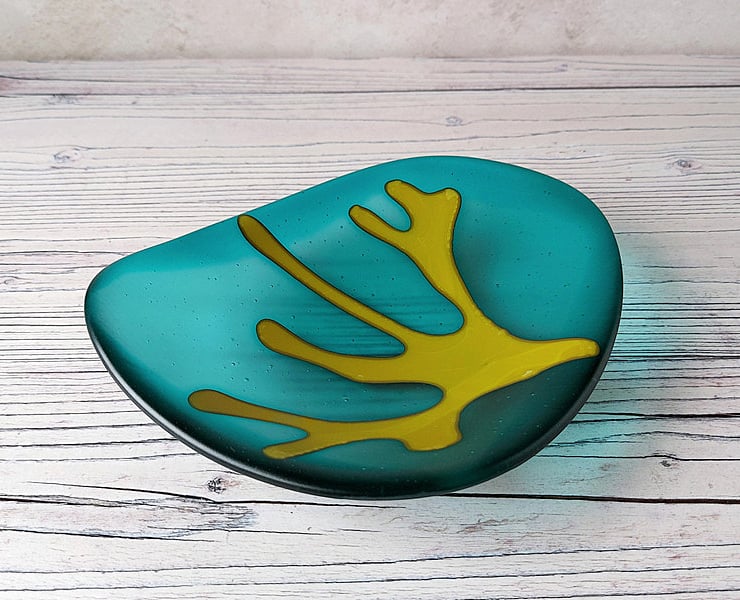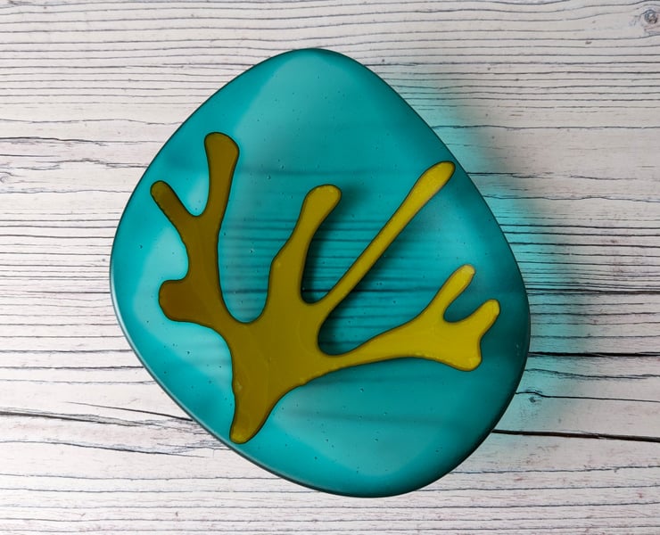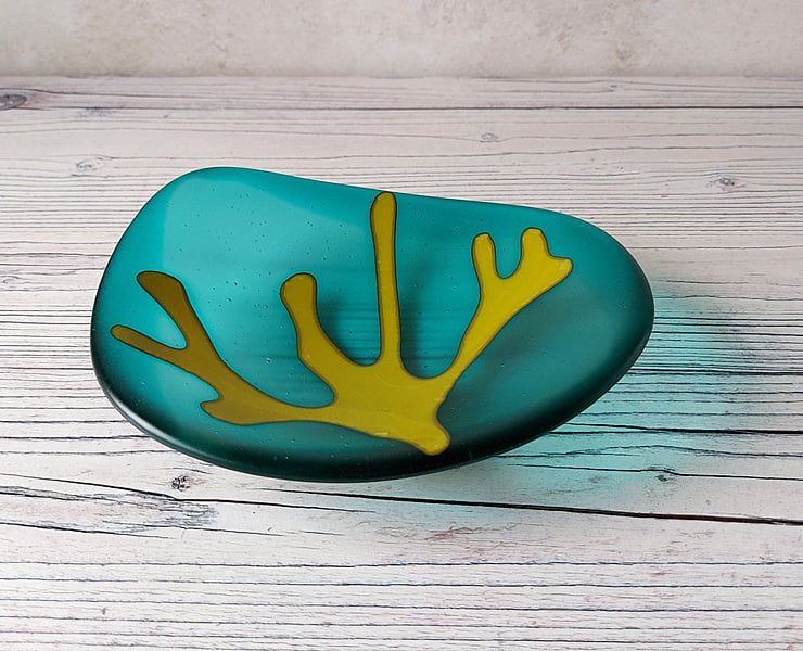 This art glass dish is a deep teal colour with a wonderfully tactile satin surface finish, just like seaglass. The shallow dish is a smooth rounded pebble shape with a frond of ochre glass seaweed stretching across the surface.