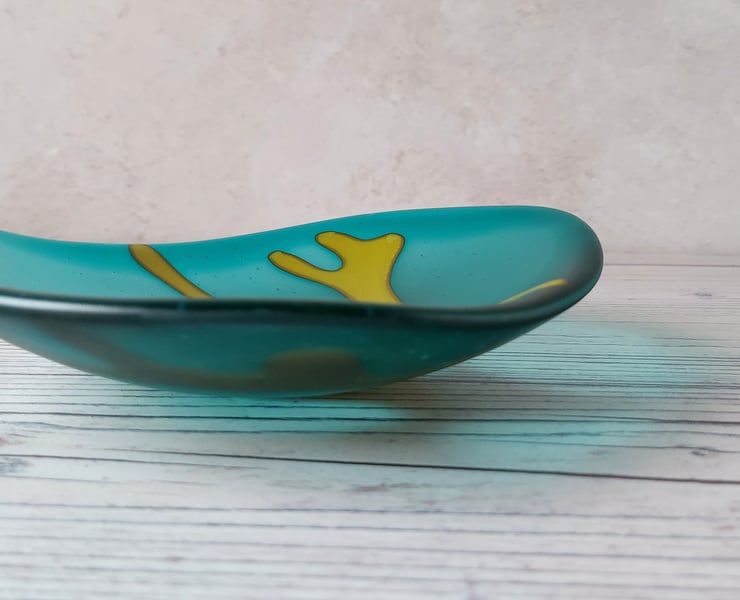 Teal and ochre satin finish fused glass dish, designed and made by me in my studio on the edge of the Wirral peninsula.