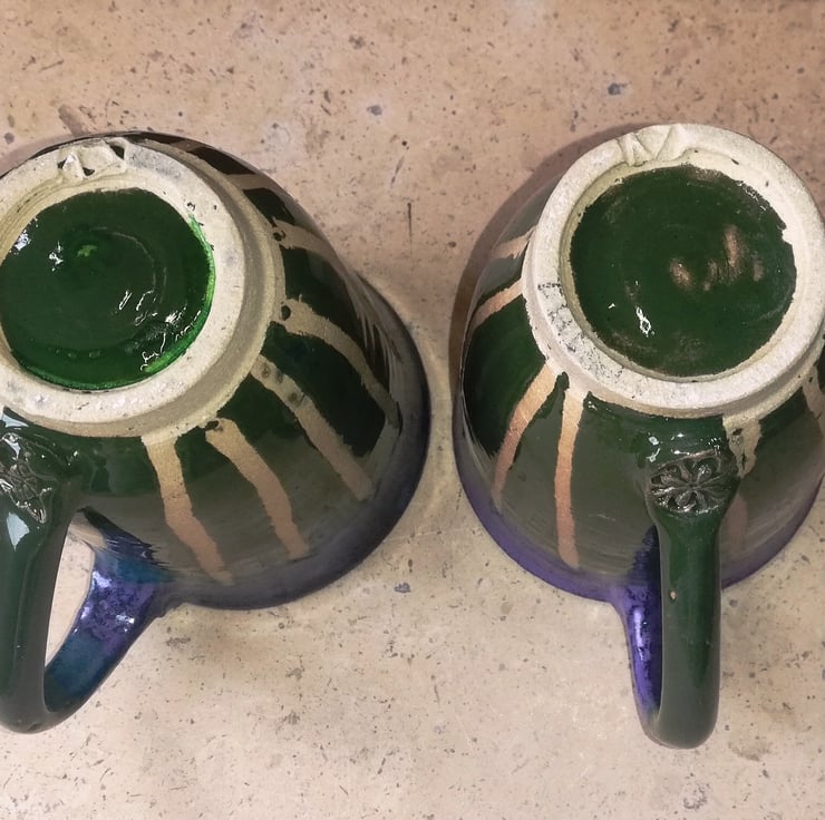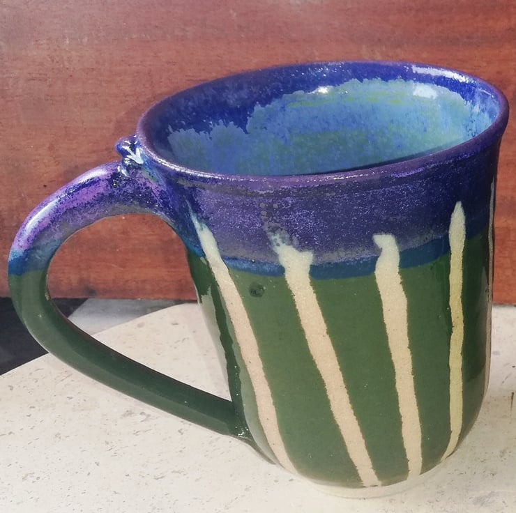 PGSM1 Purple and green glossy glazed large stoneware mug with wax resist stripes along the body. Foot ring base.