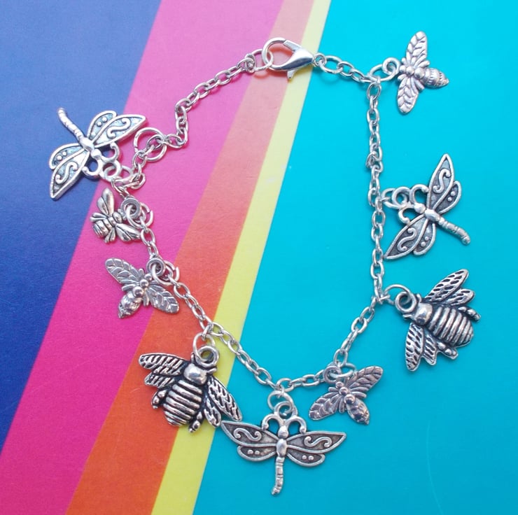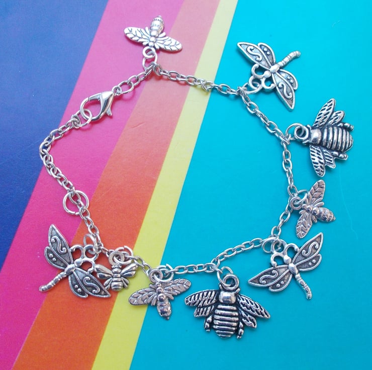 A sterling silver chain approximately 7.5"/20cm in length with a whole selection of the loveliest flying creatures in Tibetan silver. Dragonflies and different kinds of bees in all kinds of sizes. Such a lovely bracelet for bee lovers!