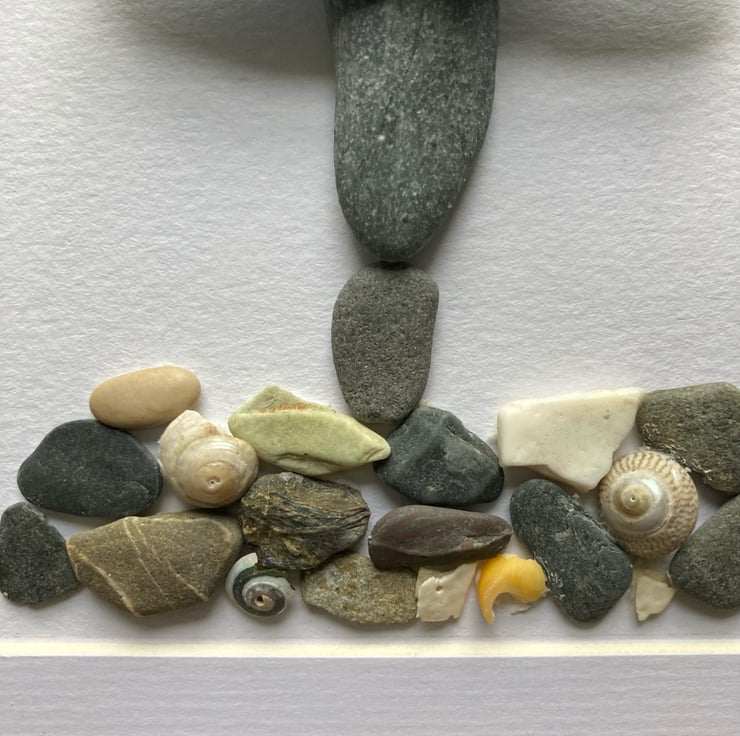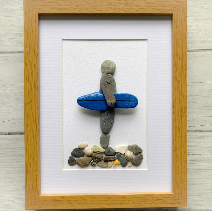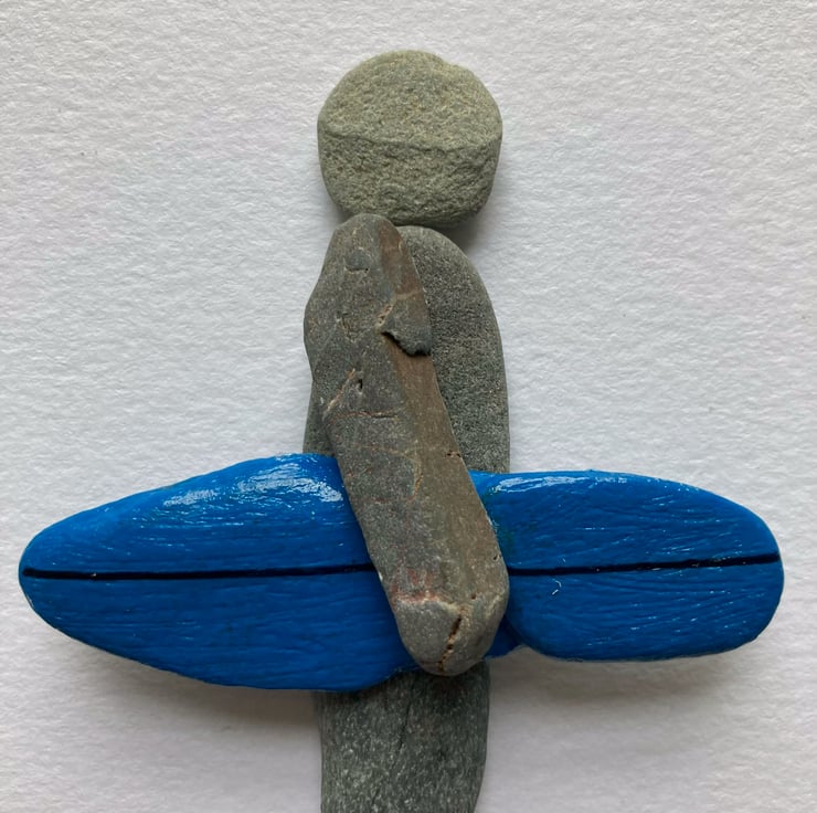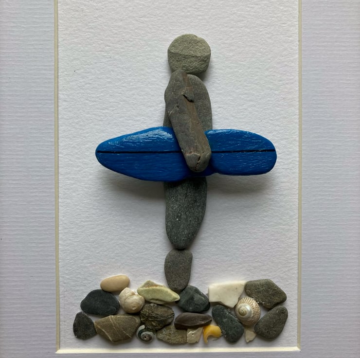 Pebble surfer design made with pebbles from Cornish beaches, the surf board is a painted pebble. The surfer is standing on a mixture of pebbles and shells.