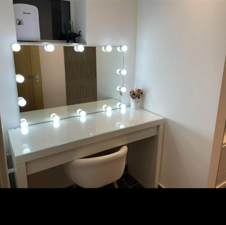 Extra large Hollywood mirror's 96x60cm new glass mirror with 14 extra bright led lights. Dimmer switch and UK plug. Long 130cm lead. Fixings included to hang if required or sits on the dressing table safely against the wall. Delivery via courier tracked service free