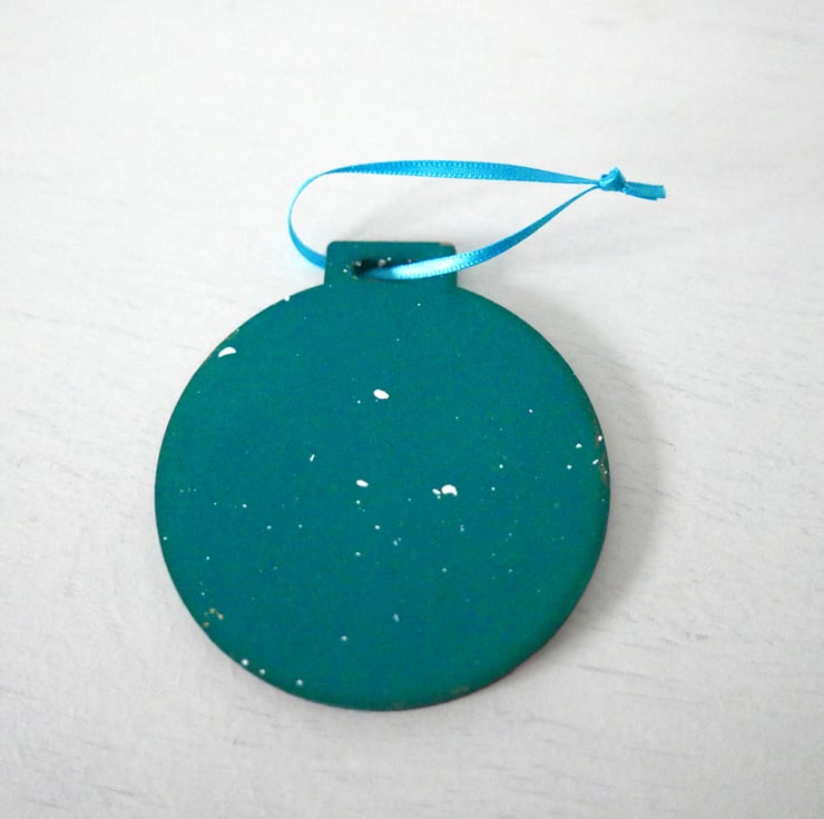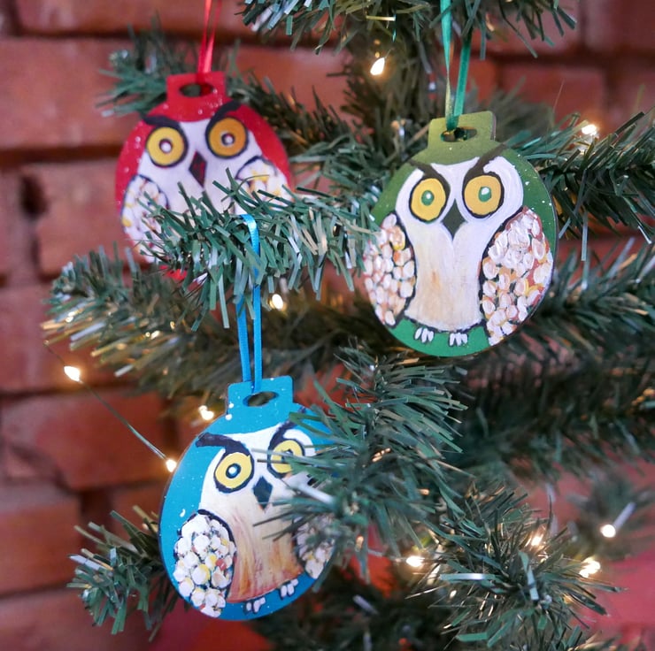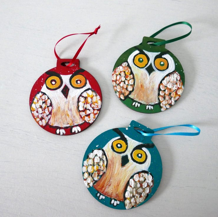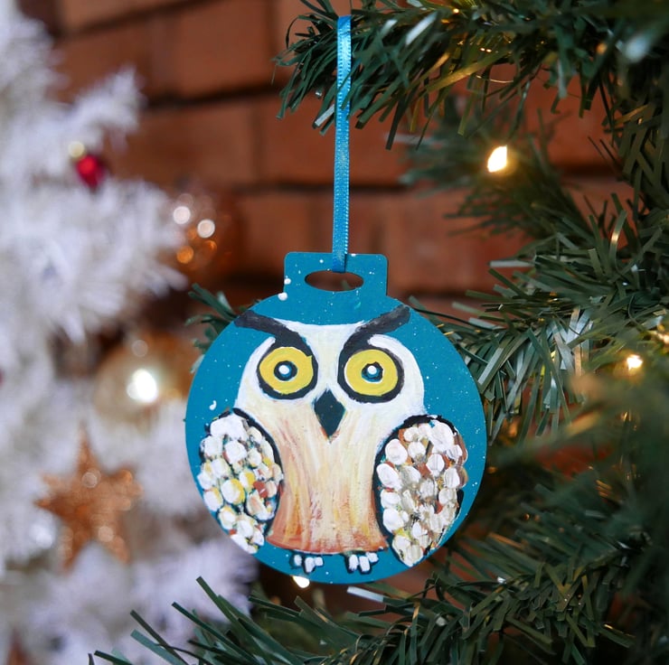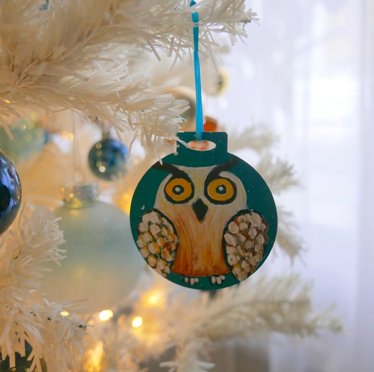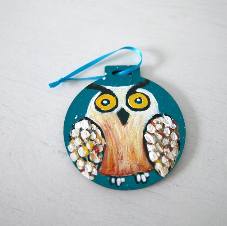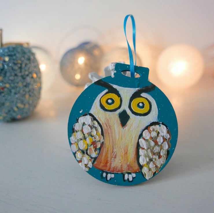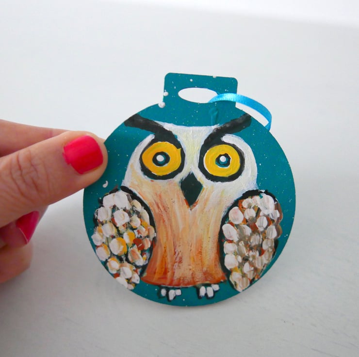 I painted this cute owl in shades of white, yellow and copper acrylic paints against a blue-teal background on a plywood bauble shape. For me, this is just like any other painting with the added bonus that you can hang it in your Christmas tree. It measures approx 2.75", it is painted on the back and it has a turquoise ribbon. The colour is a beautiful shade of teal that I find very hard to capture in a photo.