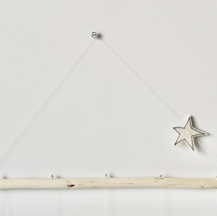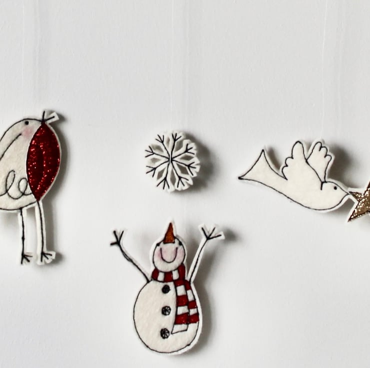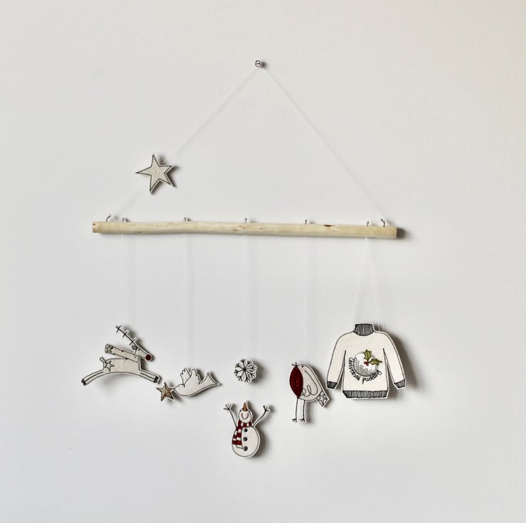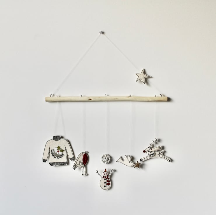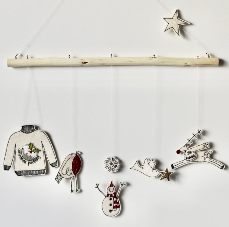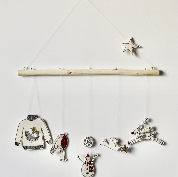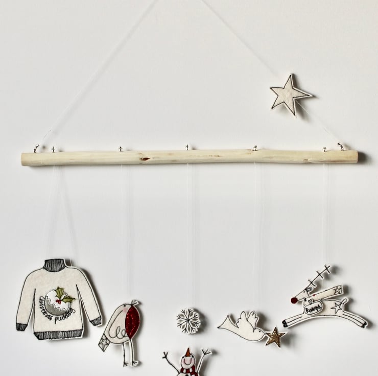 From a length of sanded drift wood are suspended five handmade decorations; a Christmas Jumper, a Robin, a Catching Snowflakes Snowman, a Dove holding a golden Star and a Reindeer.